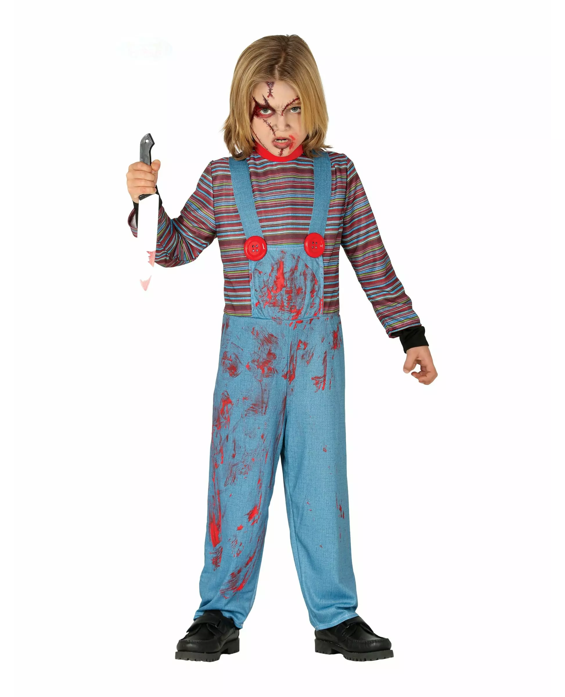 Attention! This children's costume consists of a jumpsuit (knife not included). The jumpsuit is a pair of overalls with a fake striped sweater sewn on. Red buttons and fake blood stains are featured on the costume. Play as a famous evil doll from a horror movie to scare your guests at the Halloween party!. Accessories included: Jumpsuit
