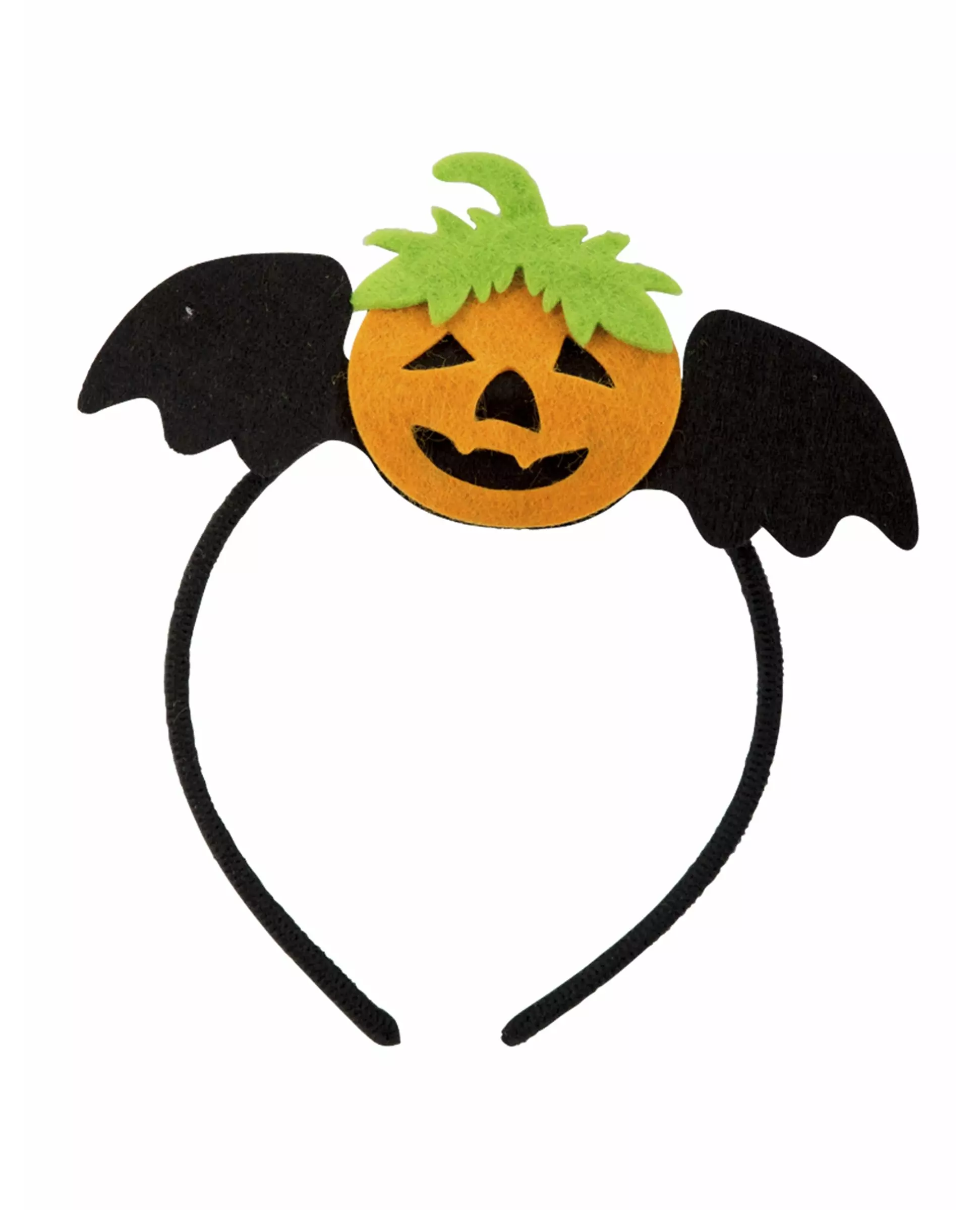 Add a touch of fun to your daughter's Halloween costume This children's headband is made of felt-effect fabric. It is black with a pumpkin with bat wings on top. It will be perfect to complete a little pumpkin costume on Halloween night. Accessories included: Headband Material: 100% Polyester