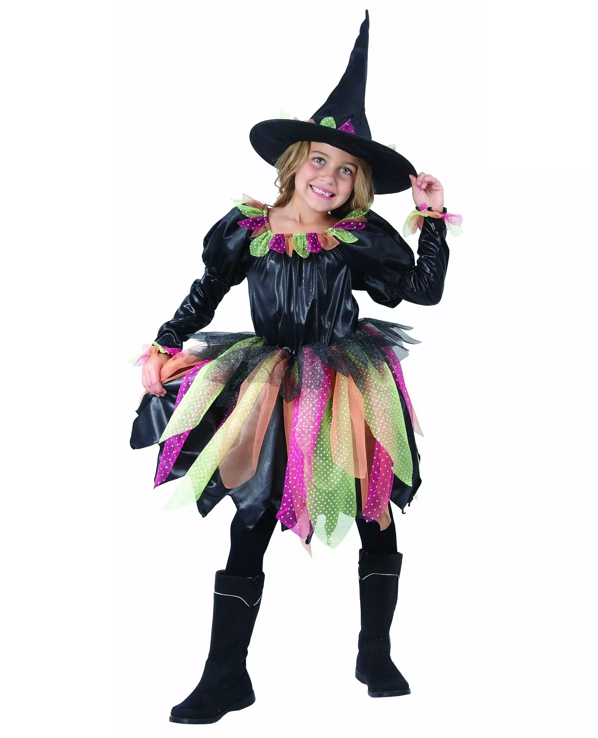 Glittery! This witch costume for children consists of a long-sleeved black dress with colorful, glittery ruffles on the collar of the outfit (tights and broomsticks not included). A black pointy hat (without embellishments) with a headband completes this costume that your child will enjoy wearing at the Halloween party. Accessories included: Dress Hat Material: 100% Polyester Care: Hand wash