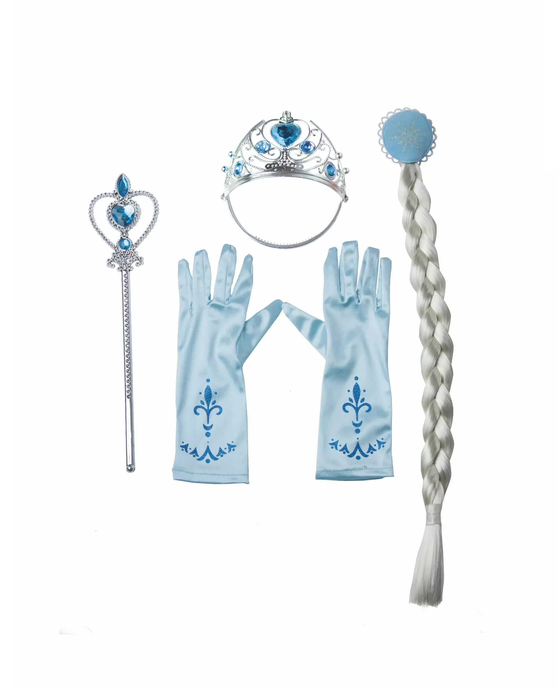Make your daughter a real princess This ice princess accessory kit for girls consists of the following elements: - 1 silver plastic princess crown with blue rhinestones - 1 matching princess wand - 1 pair of blue gloves, 25 cm long - 1 white hair braid, 50 cm long. It is worn with a metal clip. This princess kit will be perfect to complete your daughter's costume for the Carnival. Accessories included: Crown Wand 2 gloves Braid