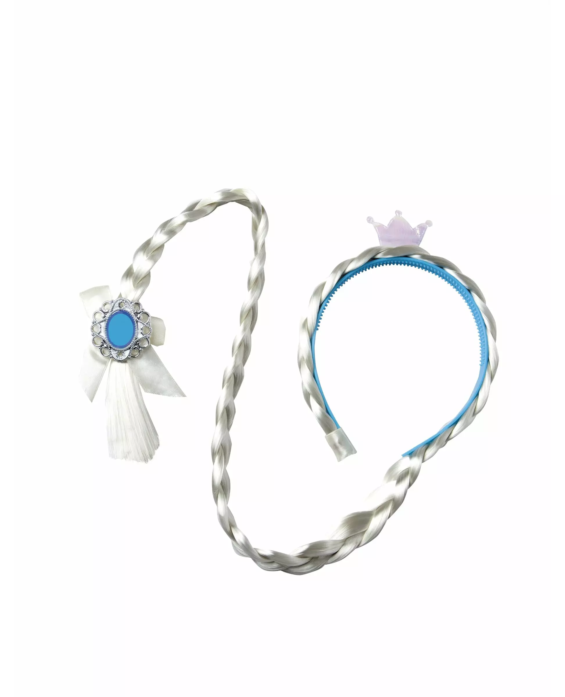 Complete your daughter's princess dress with this braid This snow princess headband for girls is made of blue plastic. A white synthetic hair braid is attached to it and falls to the side. The falling part measures approximately 55 cm in length. A small shiny fabric crown is attached to the top of the headband. This accessory will be perfect to complete a princess costume for Carnival. Accessories included: Headband with braid
