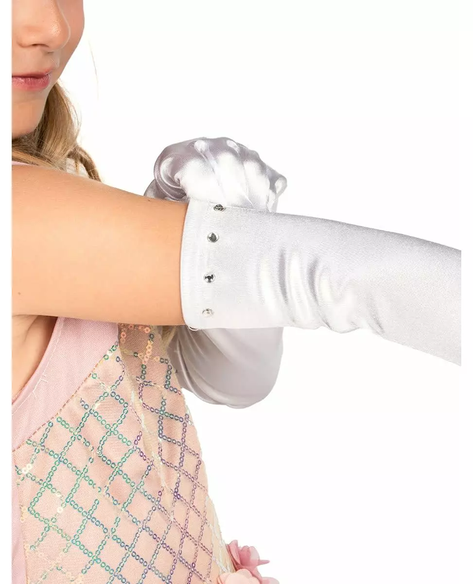 40 cm long! This pair of long white satin gloves is for girls. These white satin gloves are set with rhinestones on the top. They measure approximately 40 cm from one end to the other. This accessory is perfect to complete a princess costume, for a ceremony or even for carnival. Accessories included: 2 Gloves Material: 100% Polyester Care: Hand wash