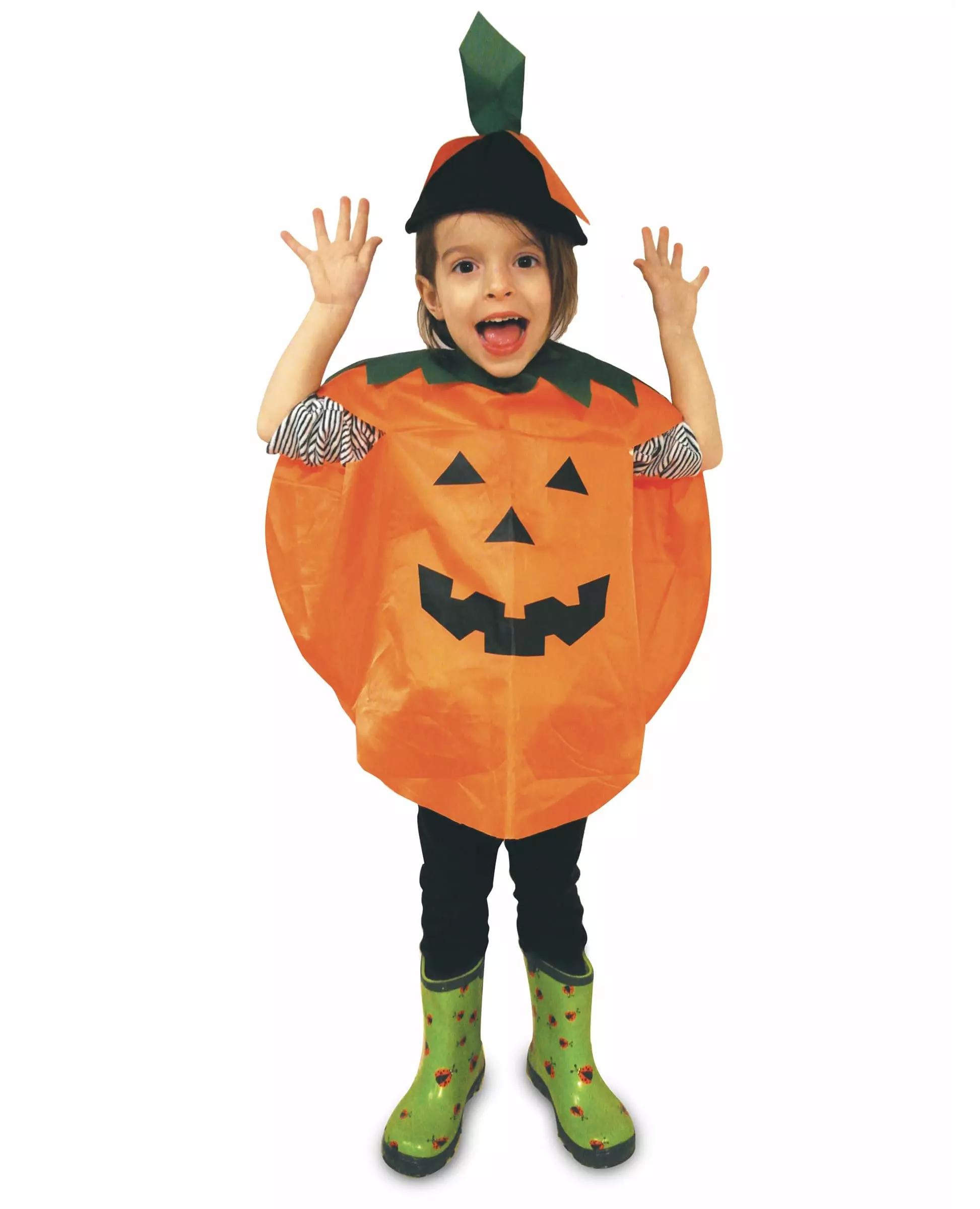 Be the cutest creature with this poncho This pumpkin poncho is for children, it includes the costume and the hat (the pants and boots are not included). The pumpkin costume is orange with a pumpkin face cut out on the front, a green leaf collar is present on the top of the costume. All you need is the hat, imitating the pumpkin's tail to put on your head to finish your outfit! Put on this pumpkin poncho for children at your next Halloween party! Material: Fabric. Accessories included: Costume Hat Care: Hand wash