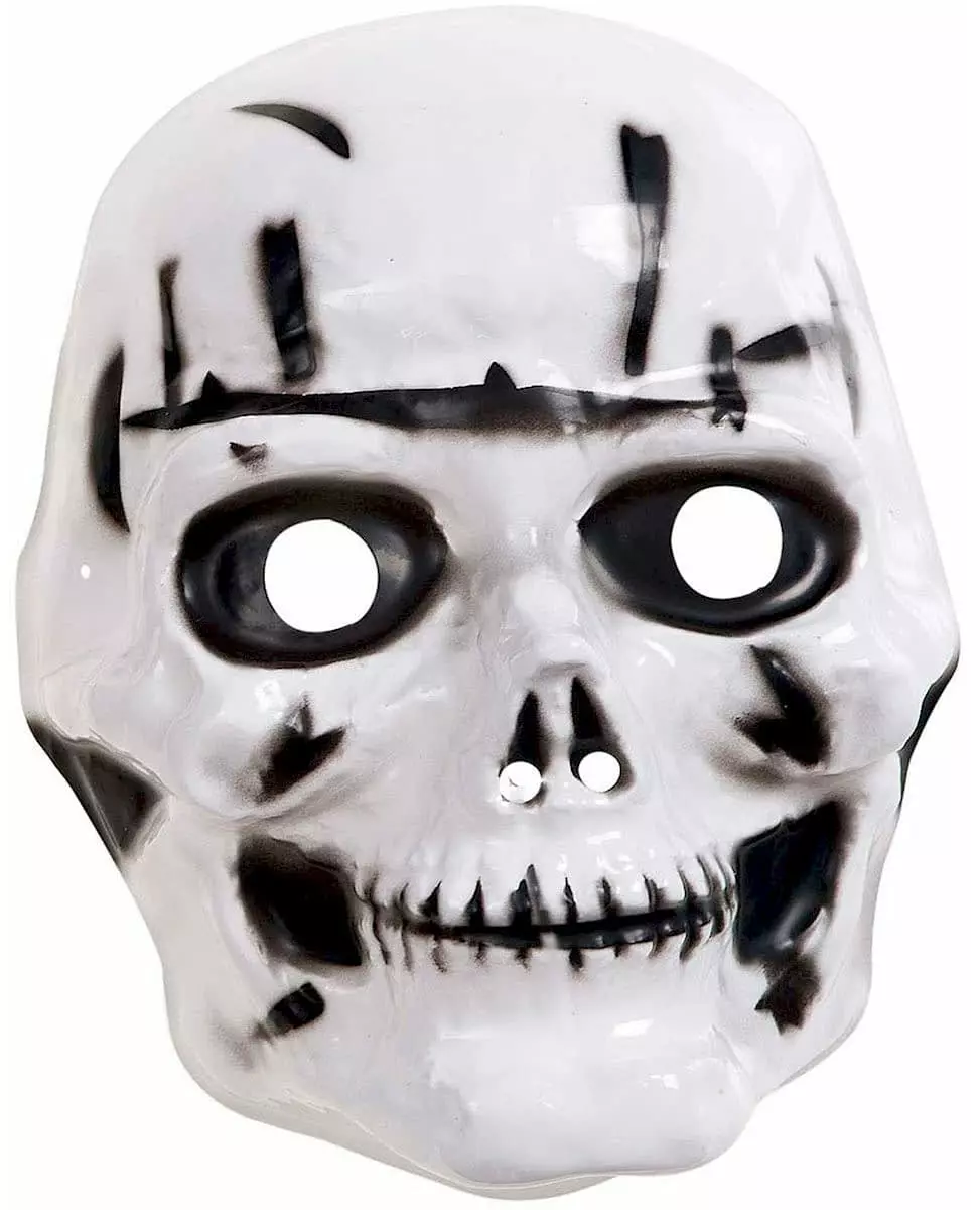 A scary costume! This skeleton mask is for children. This mask is black and white. It represents a skull and crossbones, it has 2 holes at the nose and openings on the eyes to ensure good visibility. This half mask will stay on your child's head thanks to an elastic cord on the back of the mask. This mask will be perfect for trick-or-treating on Halloween night!. Accessories included: Half mask Material: Plastic