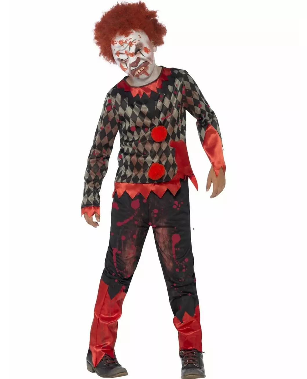 Transform yourself into a demonic clown for Halloween. This zombie clown costume for children consists of a top, pants, and a half mask (shoes not included). The top is black and gray checkered on the front and sleeves. It is solid black on the back. Parts of red satin fabric give a dilapidated look to the costume. This top closes in the back with Velcro. The pants are black and red on the bottom. Blood stains are present on the front. It is elasticated at the waist. The latex half mask represents a terrifying clown. It has a red wig that will cover the top of the head. There are openings at the eyes and nose. This zombie clown costume will be perfect for scaring your friends on Halloween night. Accessories included: Top Pants Mask Material: 100% Polyester Care: Hand wash