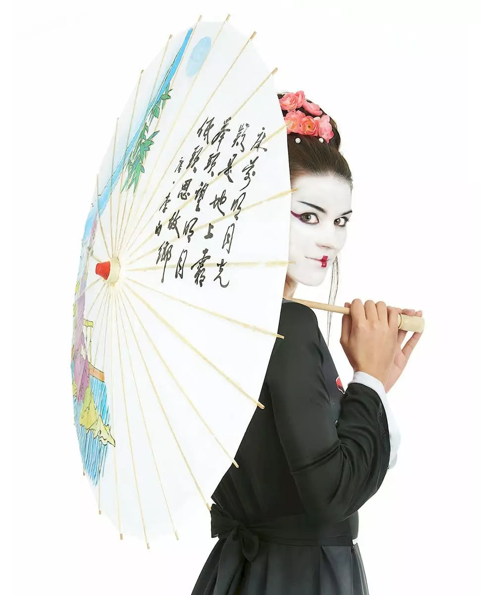 Keep your skin white! This Asian umbrella is made of wood and paper. Its diameter when open is approximately 85 cm. It can be held in place thanks to a notch on the handle. The accessory depicts a man in traditional costume next to calligraphy. The details of this object are very neat. During your fancy dress events or for a show, this accessory will be ideal to complete a Chinese lady or Geisha costume. Accessories included: Umbrella Material: Paper, Wood Paper, Wood