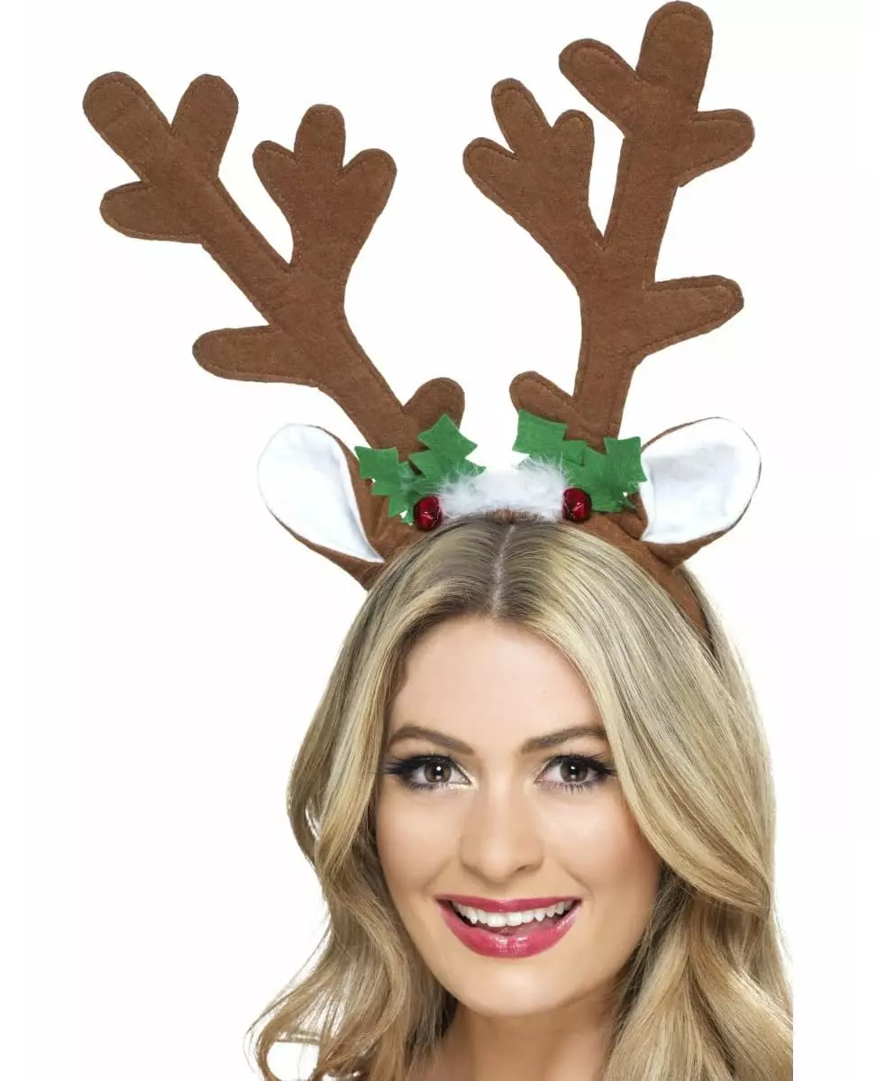 Transform yourself into a reindeer to celebrate Christmas This felt-effect Christmas reindeer headband for adults is brown in color. The two long antlers measure approximately 25 cm. Small brown and white ears are present on the sides. The bottom of the antlers is decorated with green holly leaves and red bells. The center of the headband is decorated with white feathers. This accessory will be ideal to complete a reindeer costume during the end-of-year celebrations. Accessories included: Headband