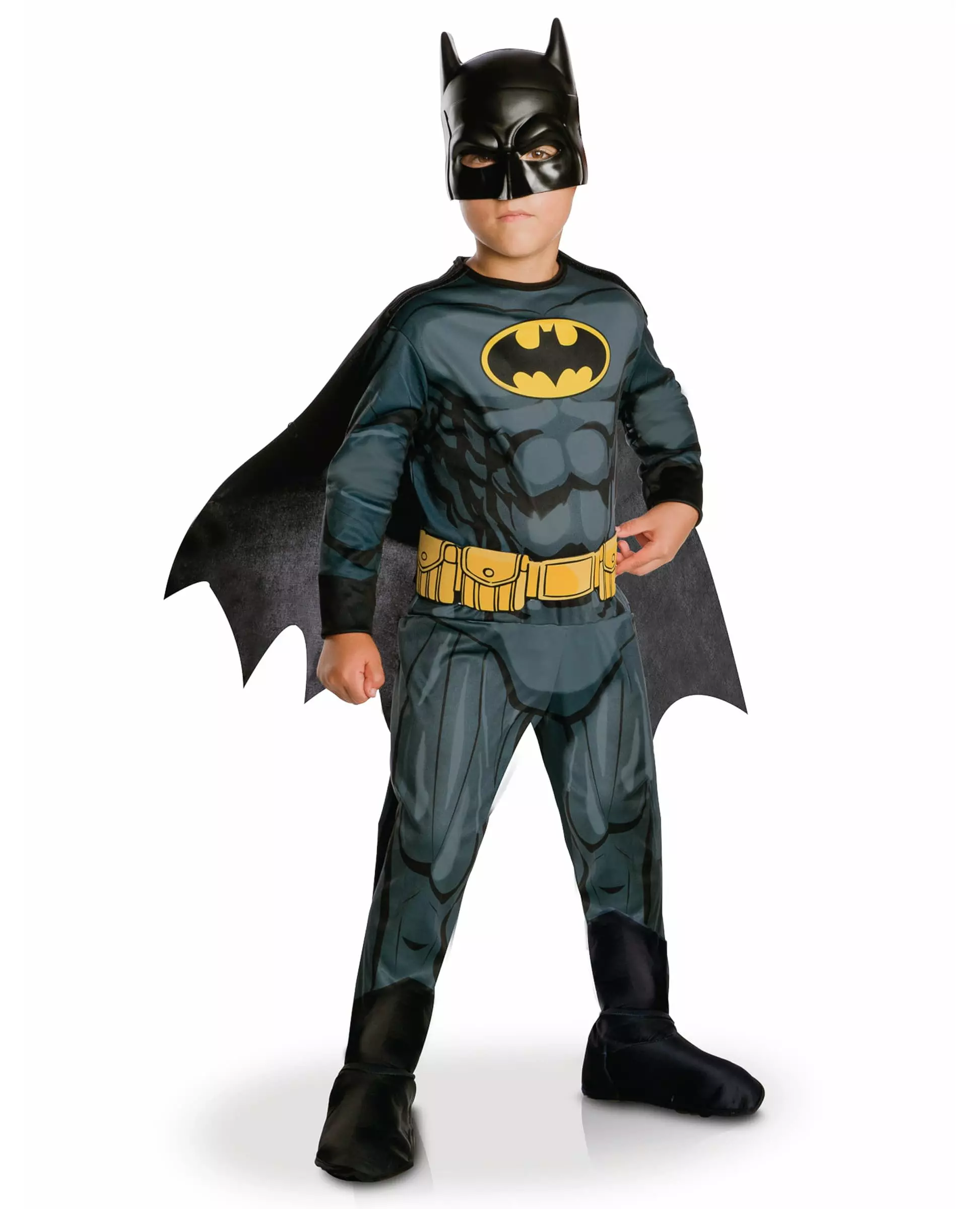 Batman costume for your child! This classic Batman costume, officially licensed by the Justice League™, is for boys. It consists of a jumpsuit with a printed belt, boot covers, a cape, and a mask. The black jumpsuit represents the armor of the famous superhero Batman. The logo is printed on the chest, and the belt is printed at the waist. The black boot covers will perfectly complete this outfit. A black cape made of fabric cut into points will stay on your shoulders thanks to Velcro fasteners. Finally, you will find a half PVC mask representing the superhero mask that will complete your outfit. This costume will be perfect for your son to play his favorite character for Carnival!. Accessories included: Jumpsuit Mask Boot covers Cape Material: Costume: 100% polyester / Mask: PVC Care: Hand wash