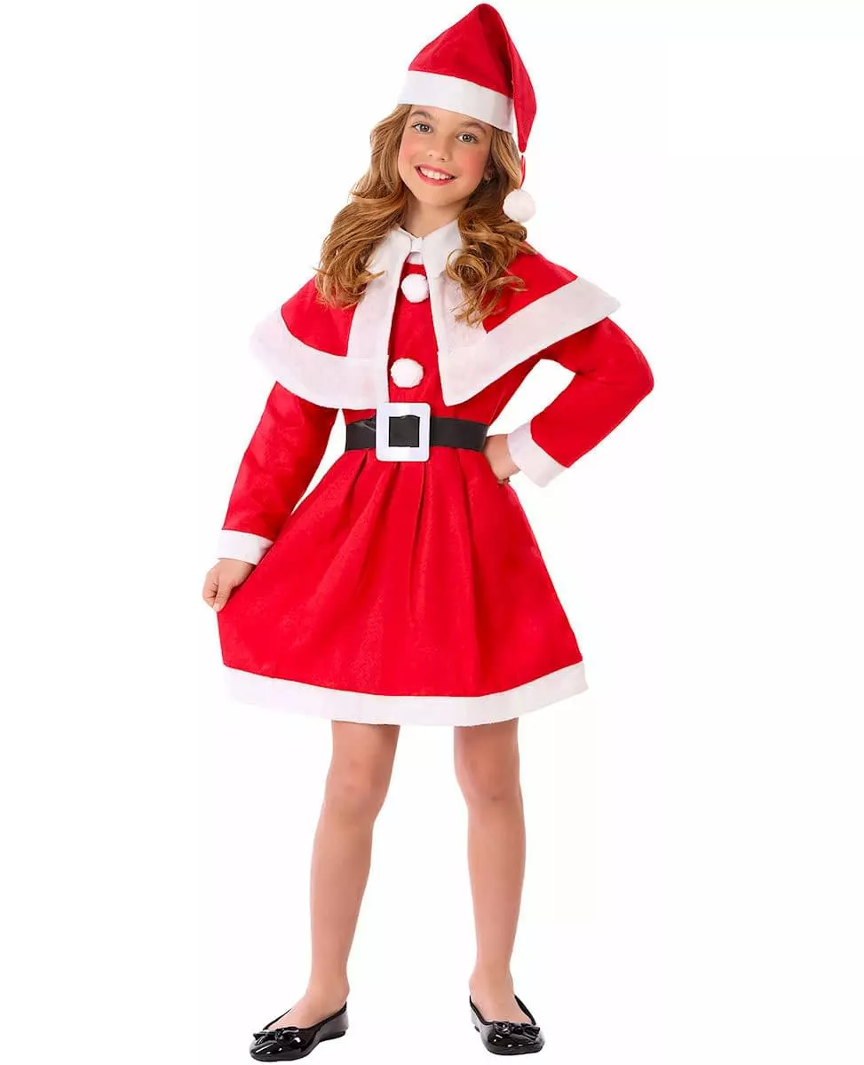 Embody the cutest little girl with this classic Santa costume! This Santa costume for girls includes the dress, belt, shawl, and hat. The dress is red with a white lapel and falls above the knees. The dress also features a black belt with a silver buckle and two white pompoms on the front. Place the shawl on the shoulders as well as the red and white Santa hat to complete your outfit. This Santa costume for girls will be perfect for a family holiday meal! Accessories included: Dress Belt Shawl Hat Material: 100% polyester Care: Hand wash