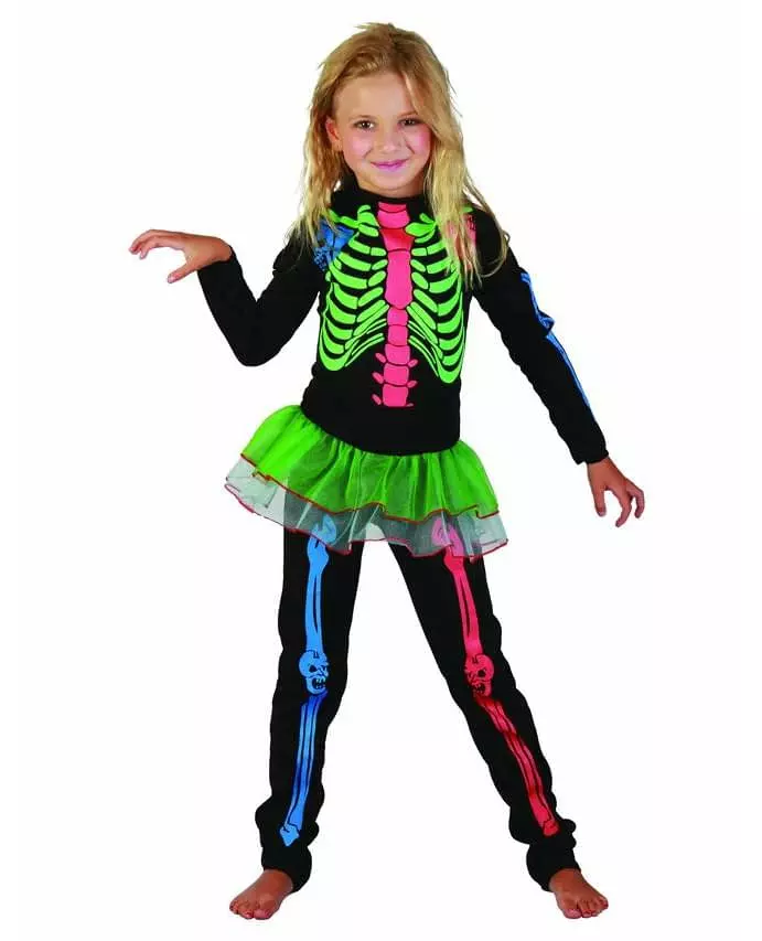Tinted bones! This children's costume represents a human skeleton. It is composed of a long-sleeved jumpsuit. On the chest, the bones of the rib cage are printed in several colors. The arm bones are also materialized, as are those of the legs. Skulls form the joints of the bones. The back of the jumpsuit is solid black. The feminine side of this costume is highlighted by two green ruffles at the waist. This jumpsuit closes in the back with Velcro. For Halloween or any other costume event, your daughter will be a hit with these fluorescent bones. Accessories included: Jumpsuit Material: 100% Polyester Care: Hand wash