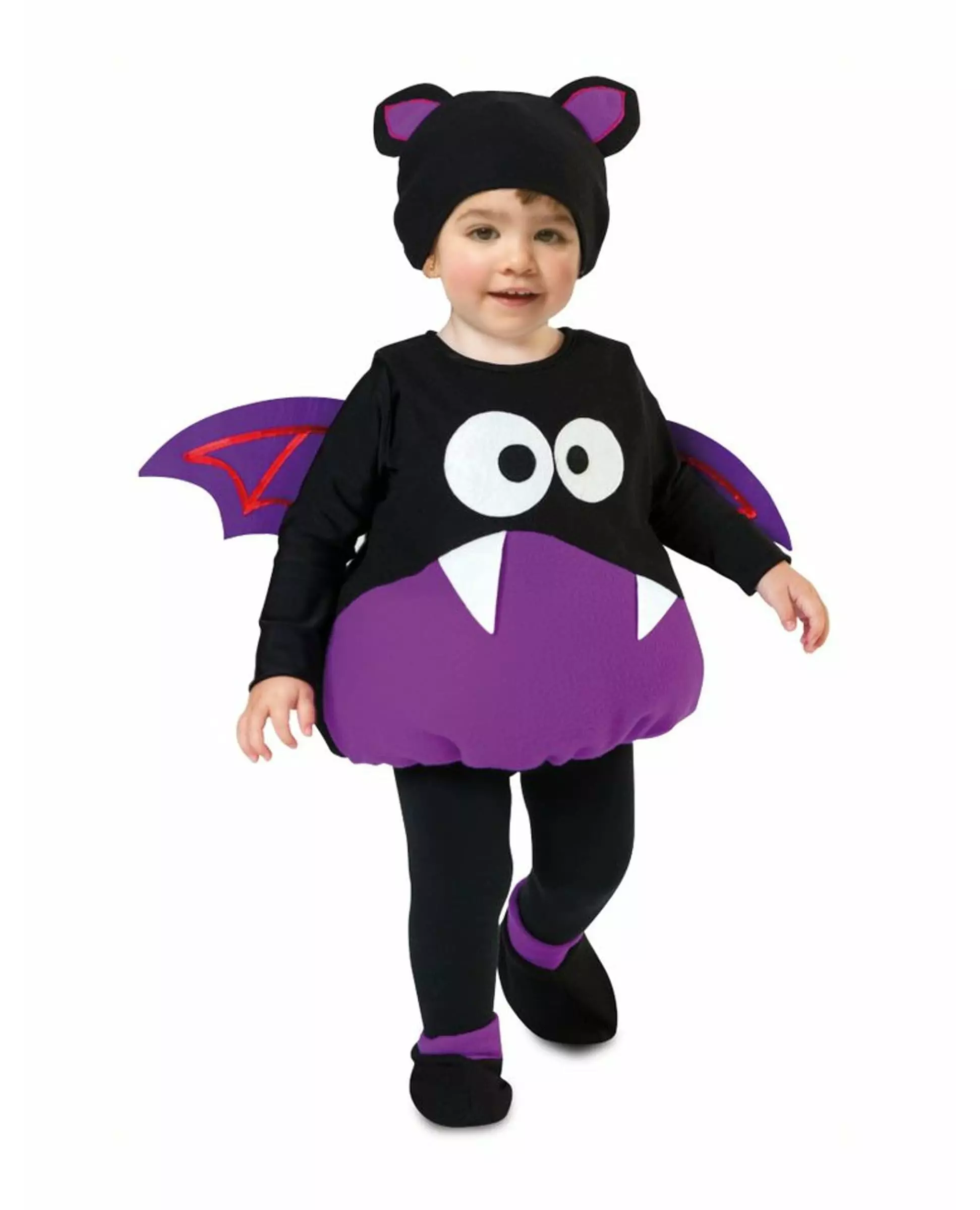 Make your child the cutest bat ever! This children's bat costume includes a jumpsuit, a hat, and slippers. The jumpsuit is black and purple. It features two teeth and eyes. It falls onto the lower part of the costume, which is also black. The slippers are the same color with purple cuffs. Wings are sewn onto the back of this jumpsuit. We have the black hat with purple and black ears that will add a cute touch to your child's costume. This costume will make your child the cutest bat at a fancy dress event. and for Halloween too. Accessories included: Jumpsuit, Hat, Slippers, Material: 100% polyester,