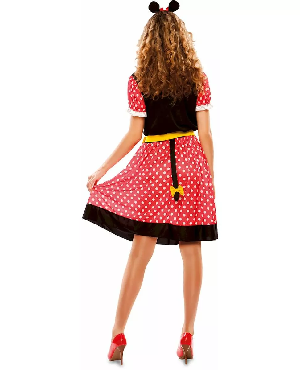 Dress up as the famous mouse for Carnival. This little mouse costume for women consists of a dress and a headband (shoes not included). The dress is black at the bust, with a white Peter Pan collar. The short sleeves are red with white polka dots, with a white border. The bottom of the dress is red with white polka dots, with a black border. Yellow ties are present at the waist and tie to form a bow on the side. The headband has small round black ears. A red bow is present between the ears. This costume will be perfect for Carnival or a childhood night. Accessories included: Dress Headdress Material: 100% Polyester Care: Hand wash