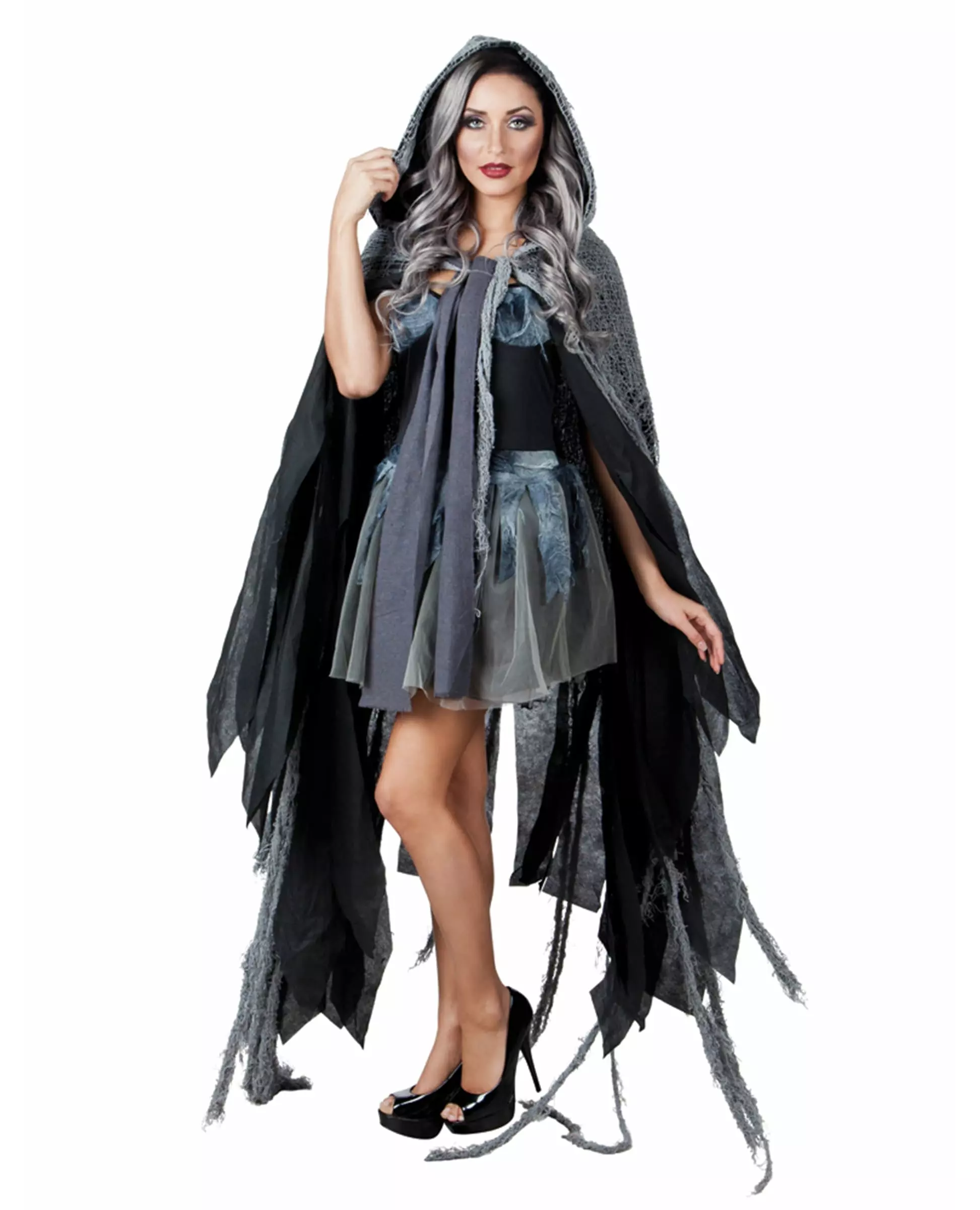 Complete your outfit with a sinister cape This black cape for adults is made of non-woven fabric. It is covered on the upper part with a gray net. This cape has a hood and is cut into tatters on the bottom. It measures approximately 150 cm in length and ties at the front with large gray ties. This cape will be perfect to complete your skeleton or ghost outfit on Halloween. Accessories included: Hooded cape Material: 100% Polyester Care: Hand wash