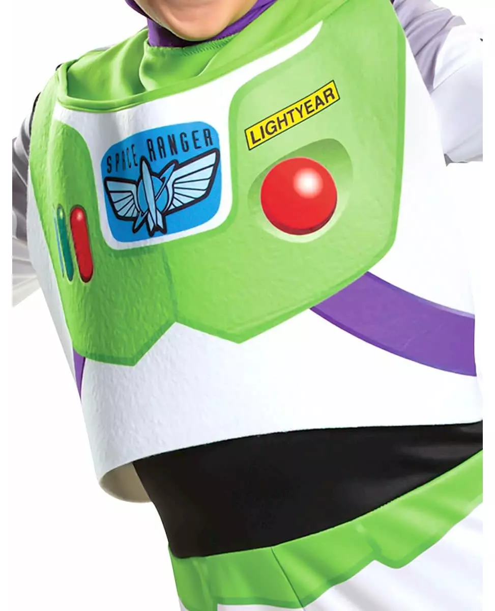 To infinity and beyond! This deluxe Buzz Lightyear costume for children is officially licensed by Disney. It includes a jumpsuit and a hood. The jumpsuit is white, green, and purple throughout. It features the same prints as the famous Buzz Lightyear's armor. You'll find button prints of all kinds, with the main inscription "Space Ranger" on the chest. The lower part includes a green border on the bottom and at the waist. To complete the set, a purple balaclava will perfect your child's jumpsuit. This Buzz Lightyear costume will be ideal for Carnival or a Birthday! Accessories included: 1 Jumpsuit 1 Balaclava Material: 100% Polyester Care: Hand wash
