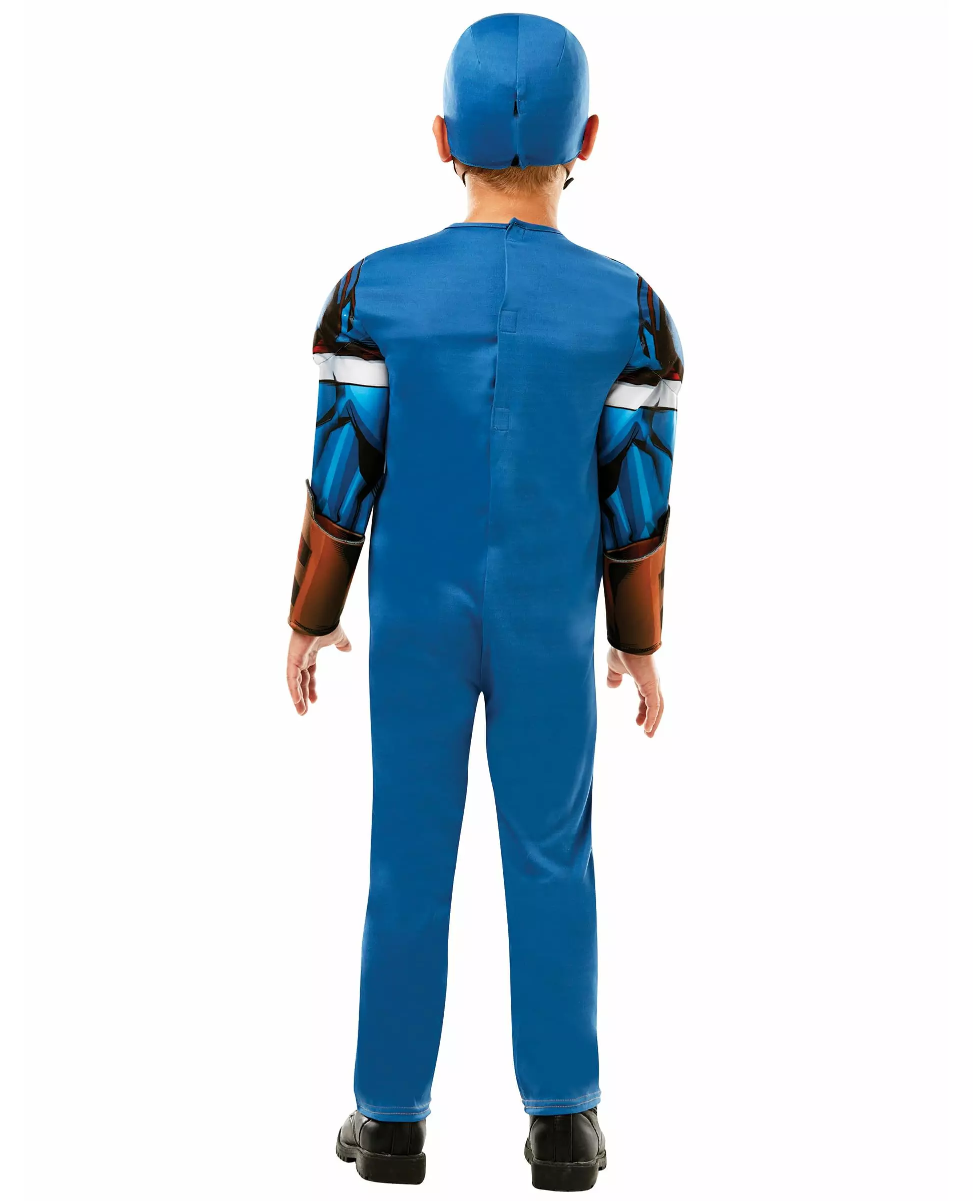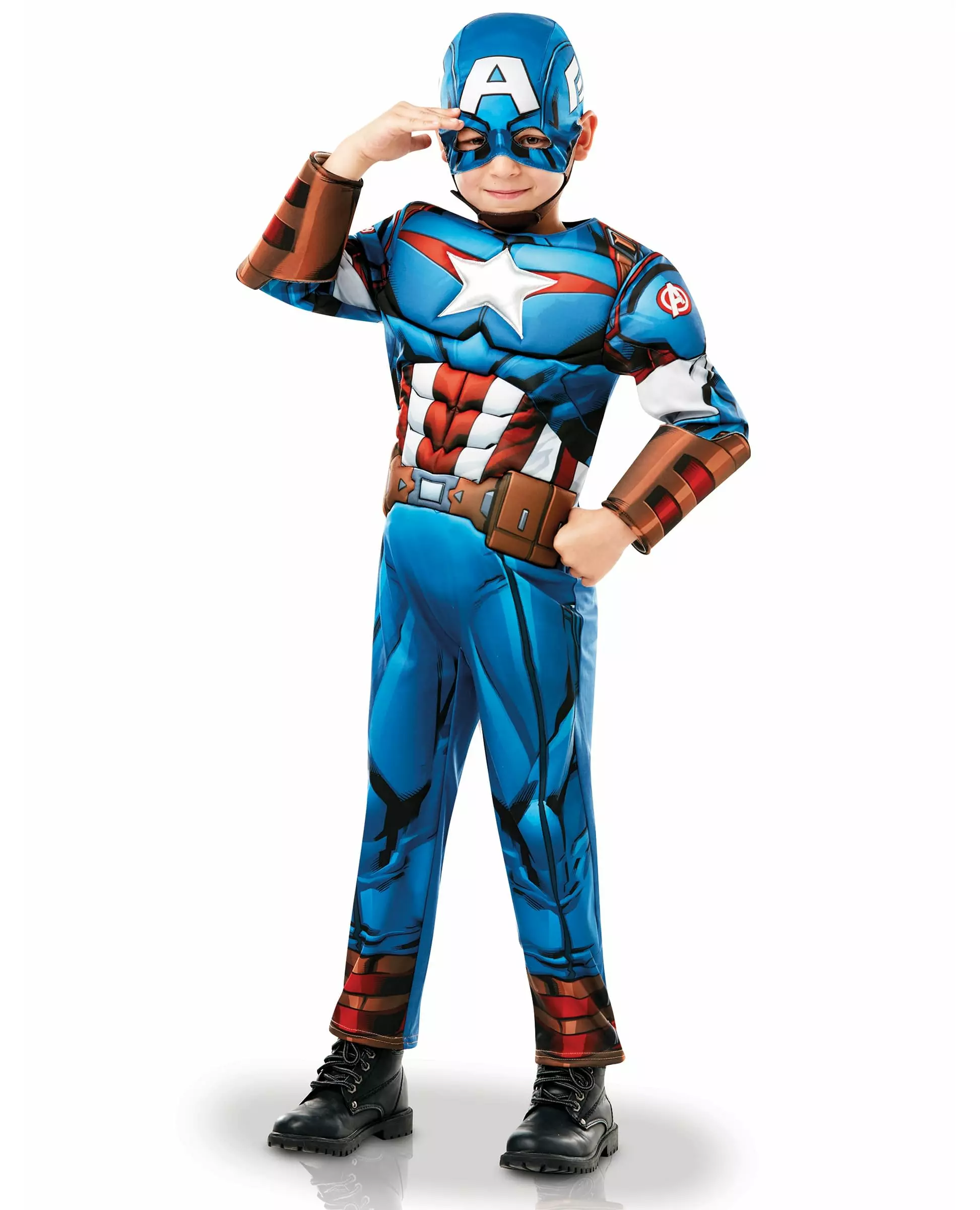 super soldier! This deluxe Captain America™ costume is for boys. Officially licensed by Marvel™, this costume from the Avengers animated series features a padded, front-printed fabric jumpsuit and a printed fabric hood. The fabric jumpsuit is padded to mimic the impressive muscles of this man who has become a super soldier and superhero at the same time. It slips on and closes in the back with Velcro straps provided for this purpose. Finally, this blue fabric jumpsuit is printed with Captain America's jumpsuit on the front. It is blue with imitation cuffs and gaiters. It has all the details of the American flag present on the official outfit of this superhero leader of the Avengers such as the white star on the chest or the white and red stripes on the abs. This jumpsuit is accompanied by a blue fabric hood with a chin strap that ensures a good fit. It has the A of the Avengers and two openings at eye level, like the hood from the Avengers movie or Captain America. Finally, for even more comfort, it closes on the back of the skull thanks to a velcro. This complete and quality disguise will delight your son at a superhero-themed party, Carnival or fancy dress birthday party. Accessories included: Padded jumpsuit Printed fabric hood Material: Polyester Care: Hand wash
