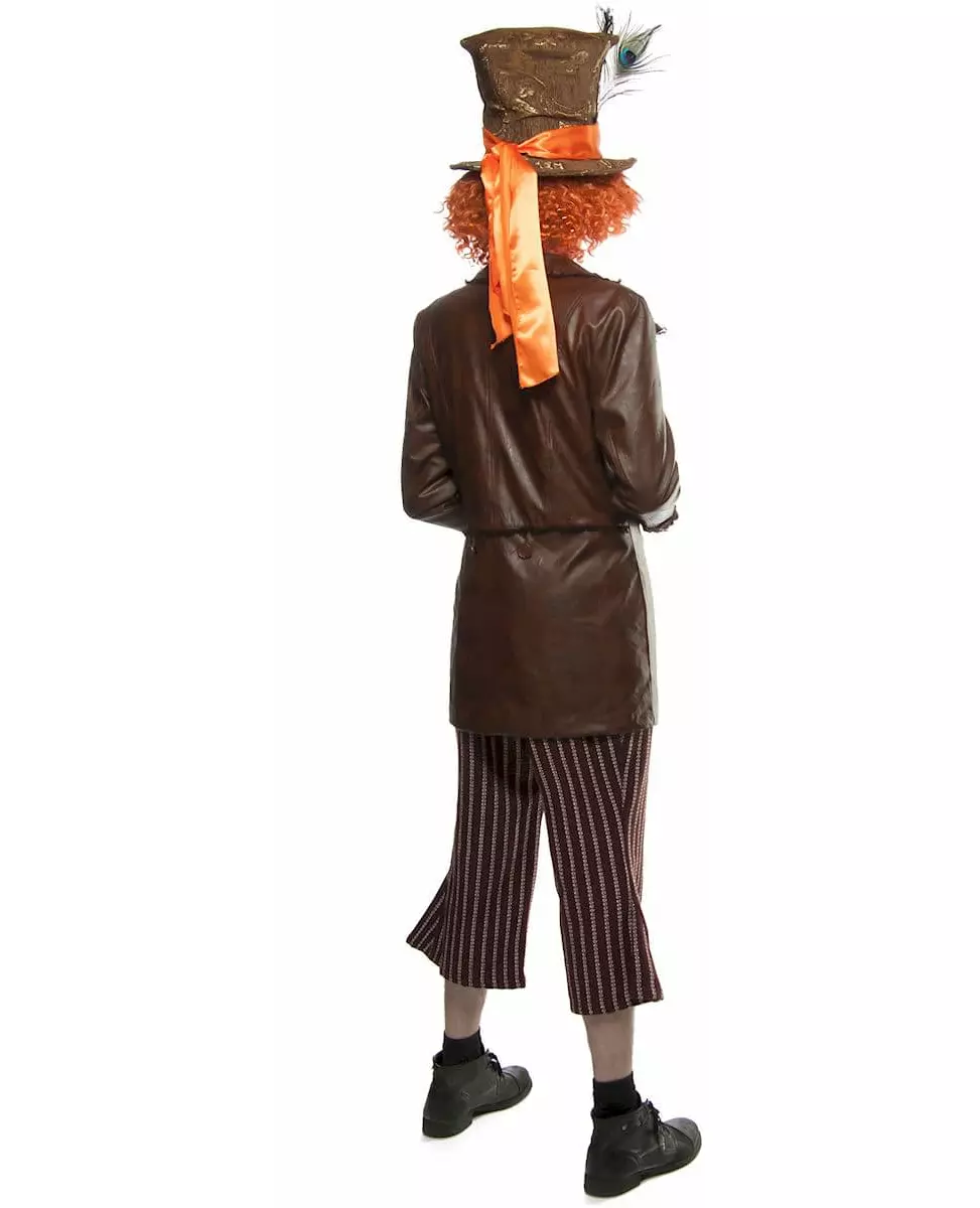 Step into Alice's world with this Mad Hatter costume. This Mad Hatter costume for adults consists of a shirt, a jacket, capri pants, a hat, a wig, and a bow tie. The long jacket is brown in a faux-leather fabric. Colorful ribbons are featured on the sides. The shirt is satin pink. It is completed with a large black bow with floral patterns. The capri pants are slightly flared at the bottom. They are burgundy with white lines. The top hat is accessorized with an orange ribbon, a 10/6 label and feathers. Finally, a wig completes this costume. It has tousled orange synthetic hair. This high-quality and very complete costume will be perfect for a show or a Carnival. Accessories included: Wig Bow tie Hat Shirt Jacket Pants Material: 100% Polyester Care: Hand wash