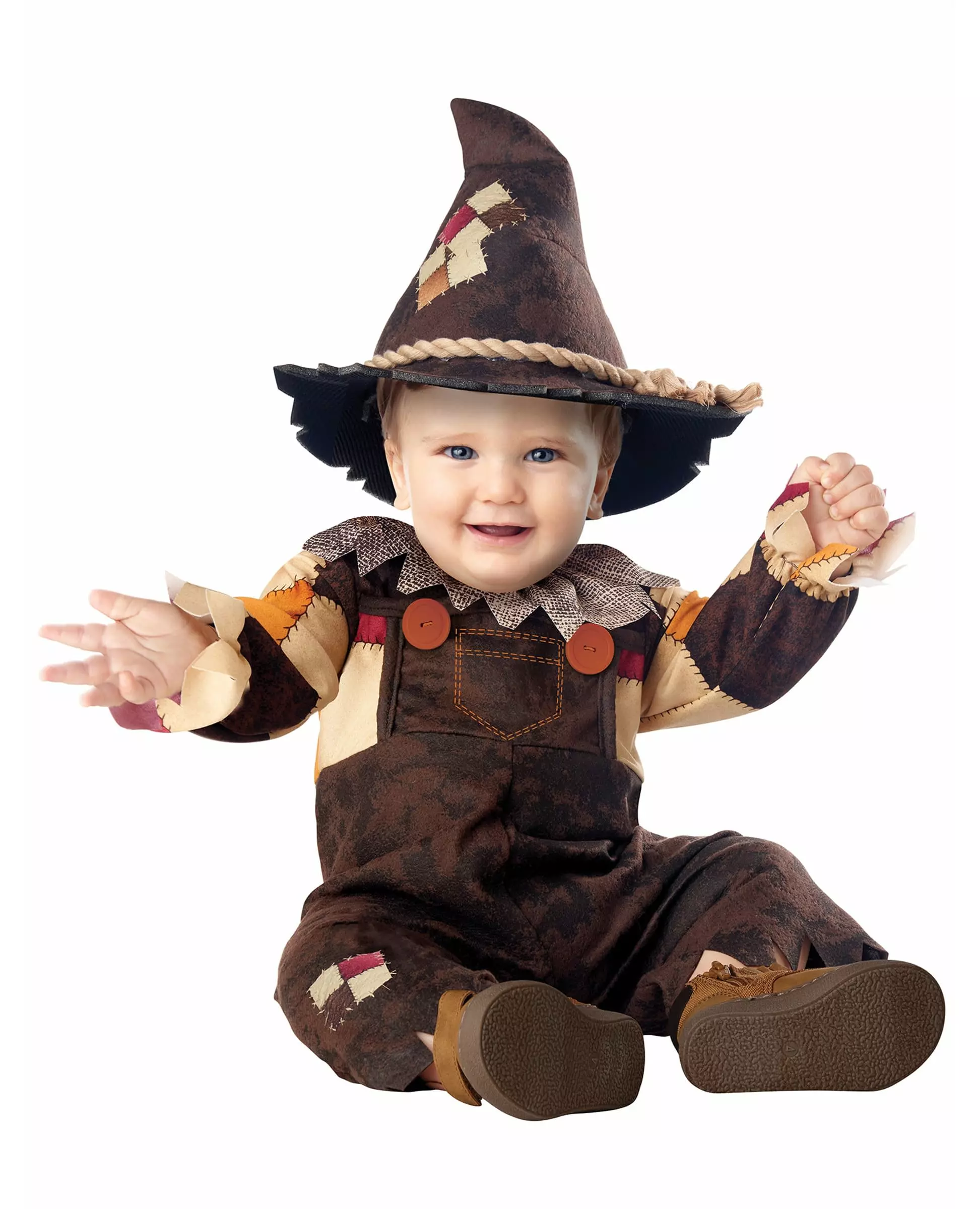 Baby will be the cutest in his Halloween costume This scarecrow costume for babies consists of a jumpsuit and a hat (shoes not included). The jumpsuit represents brown overalls, worn over a patched-effect top. It also has a small collar that is printed with a burlap-effect fabric. A pointed hat completes this costume. It is brown with a cord at its base. This costume will be perfect for having baby participate in the Halloween party. Material: 100% Polyester. Accessories included: Jumpsuit Hat Care: Hand wash