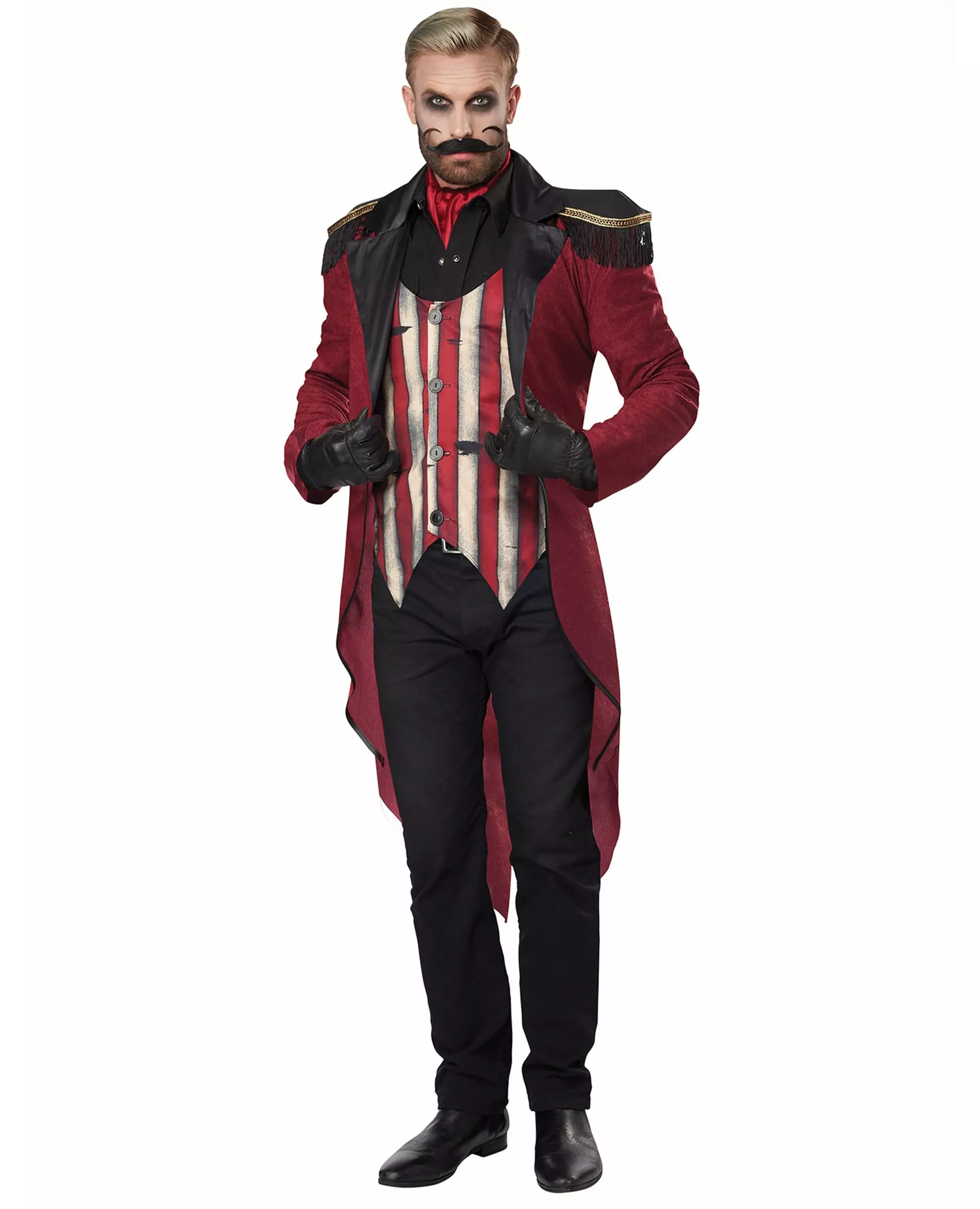 Embody the most terrifying clown with this scary tamer costume for adults! This scary tamer costume is for adults, it includes the jacket, the vest, the neck warmer, the hat and the mask (the pants, the shoes, the gloves and the stick are not included). The jacket is red in tails with black epaulettes, the vest that goes under the jacket has red, gray and white stripes. To be a real tamer, put on the black and red neck warmer that matches the outfit. The white mask reveals a wide mouth with long yellowed teeth, black eyes and dark mid-length hair. All you have left is the black hat with a red and white lapel to put on your head to complete your outfit. Don this spooky tamer costume for your Halloween party! Material: 100% Polyester. Accessories included: Jacket Vest Neck warmer Hat Mask Care: Hand wash