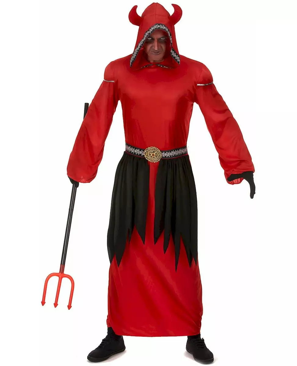 demon! This demon costume is for men and includes a dress and a belt (pitchfork, pants, shoes, and gloves not included). The bright red dress is very long with long, flared sleeves. A large hood with a "skull" border will cover most of your head. Two thick felt horns top the headpiece. A belt to tie in the back will mark your waist. Black fabric panels cut into points at their ends will perfectly dress the top of your legs. The golden plastic buckle adds a precious dimension to the ensemble. Bring out the demon in you. for a fancy dress party with friends like Halloween! Accessories included: Dress with hood Belt Material: 100% Polyester Care: Hand wash