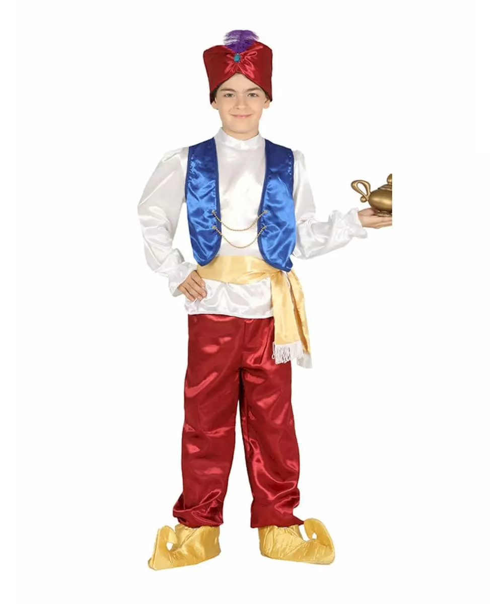 With the help of the genie, transform yourself into an oriental prince This oriental prince costume for boys consists of a top, pants, a hat and a belt (shoes and lamp not included). The satin top is white, with long sleeves. It has a blue sleeveless vest over it. The baggy pants are red. A belt completes this costume. It is pale yellow with white fringes. It ties at the waist. The sultan's hat is red, with a colorful fake feather in the center. This costume will be perfect for transforming your son into an oriental sultan. for a 1001 nights party.. Accessories included: Top Pants Hat Belt Material: 100% polyester Care: Hand wash