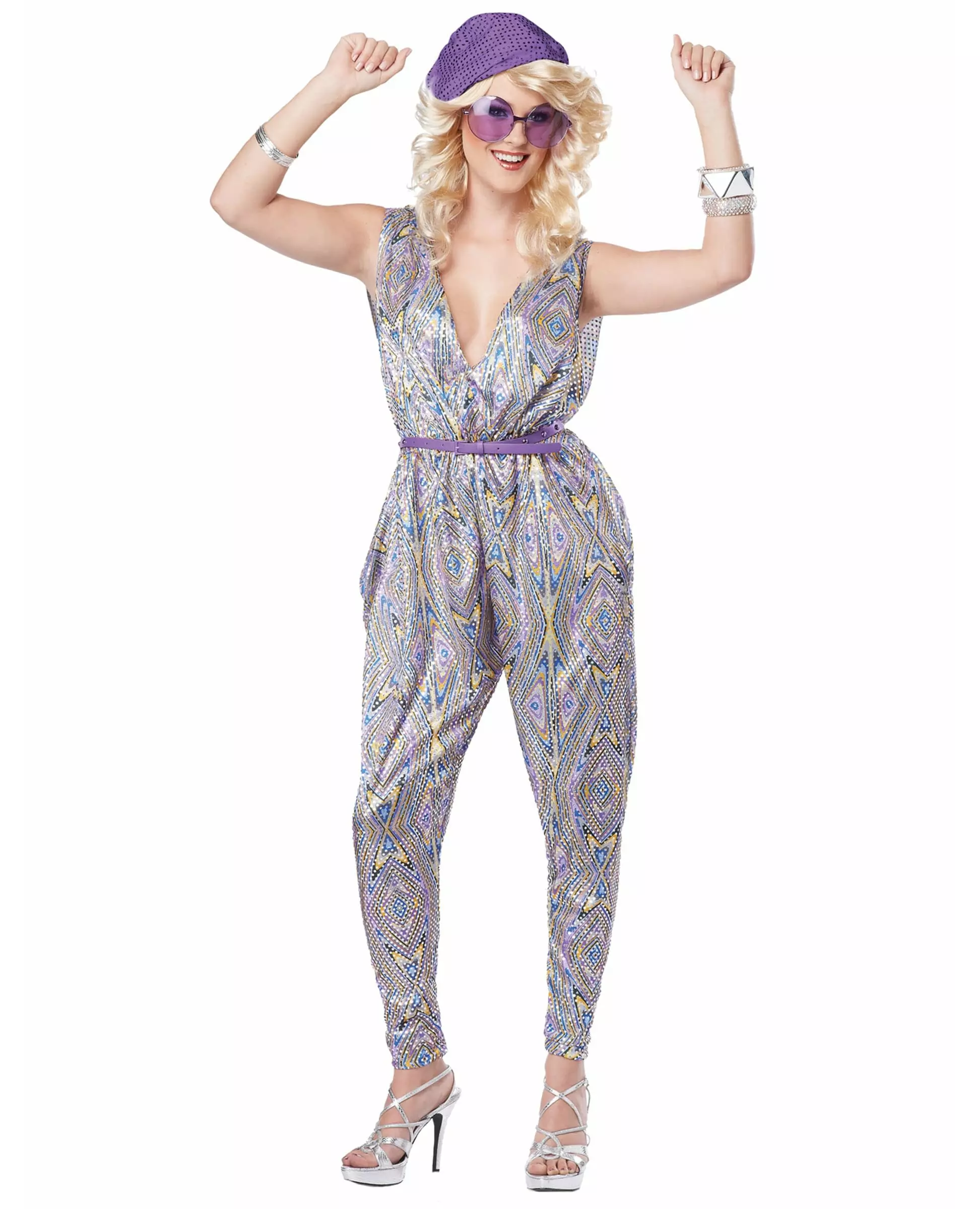 Shine bright with this disco costume! This women's disco costume consists of a jumpsuit, a headpiece, and a belt. The jumpsuit is made from a multicolored satin fabric. It is sleeveless and puffy at the waist. It also has pretty graphic patterns and rhinestones that will make you shine brightly. Finally, a V-neckline will add a sexy touch to your outfit. A purple belt is also included and will allow you to cinch the garment according to your body shape. A pink elastic headpiece with sequins will add the finishing touch to this ensemble. This costume will be perfect for setting the dance floor alight at your disco-themed fancy dress parties. Accessories included: Jumpsuit Headpiece Belt Material: 100% polyester Care: Hand wash