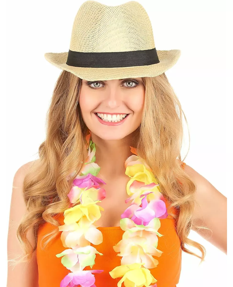 Very light! This borsalino hat is made of soft, off-white straw with a black fabric band. It will fit circumferences of approximately 59 cm. This very light hat will be pleasant to wear to protect you from the sun!. Accessories included: Hat Material: Straw