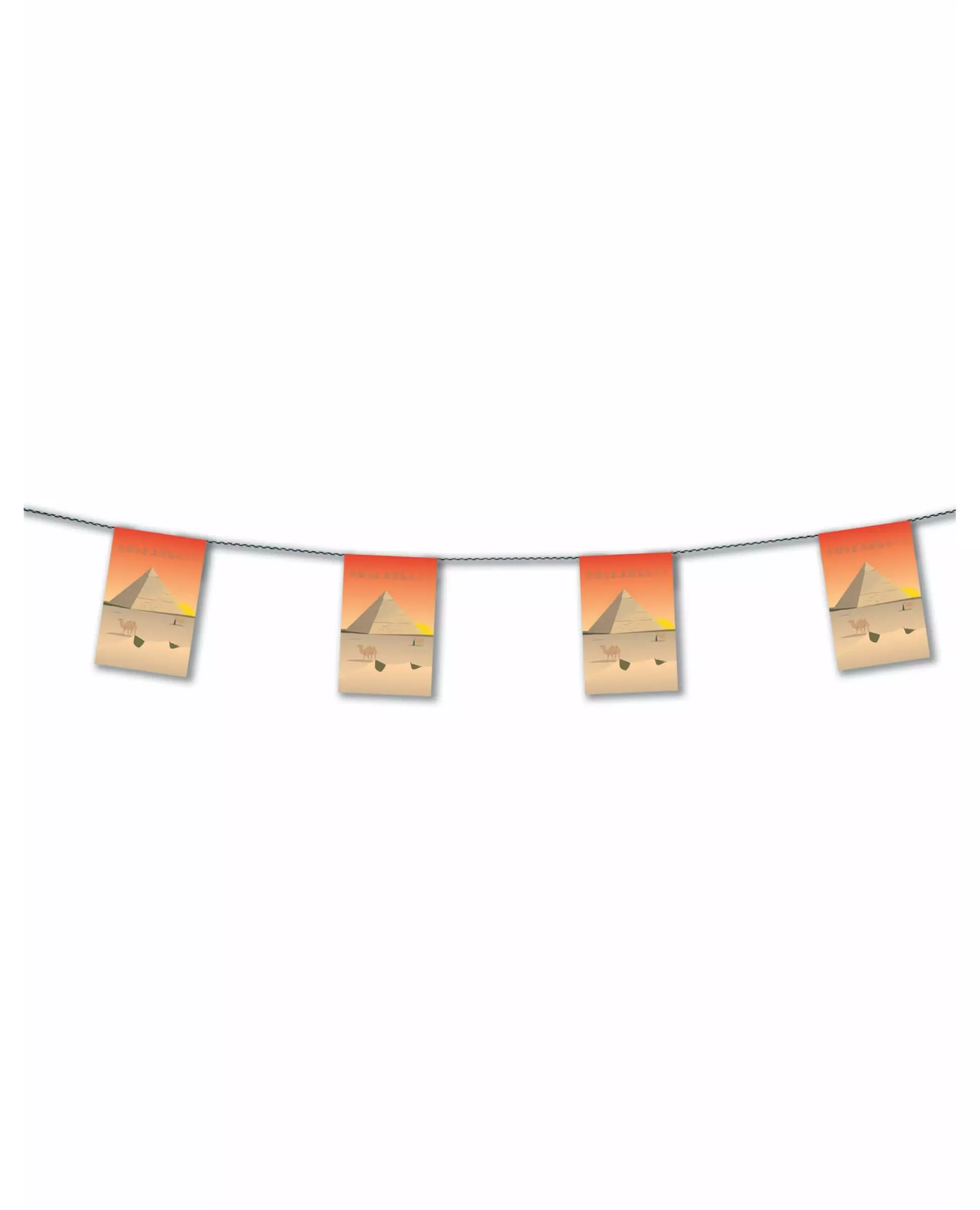 very Egyptian decoration! This Egyptian garland measures approximately 4 meters. It is made up of several paper pennants that are hung on a white tie. Each pennant is printed with an Egyptian pyramid as well as Egyptian hieroglyphs. One pennant measures approximately 30 x 20 cm. This garland will be perfect to complete your decor for a themed party! Accessories included: 1 garland Material: Cardstock