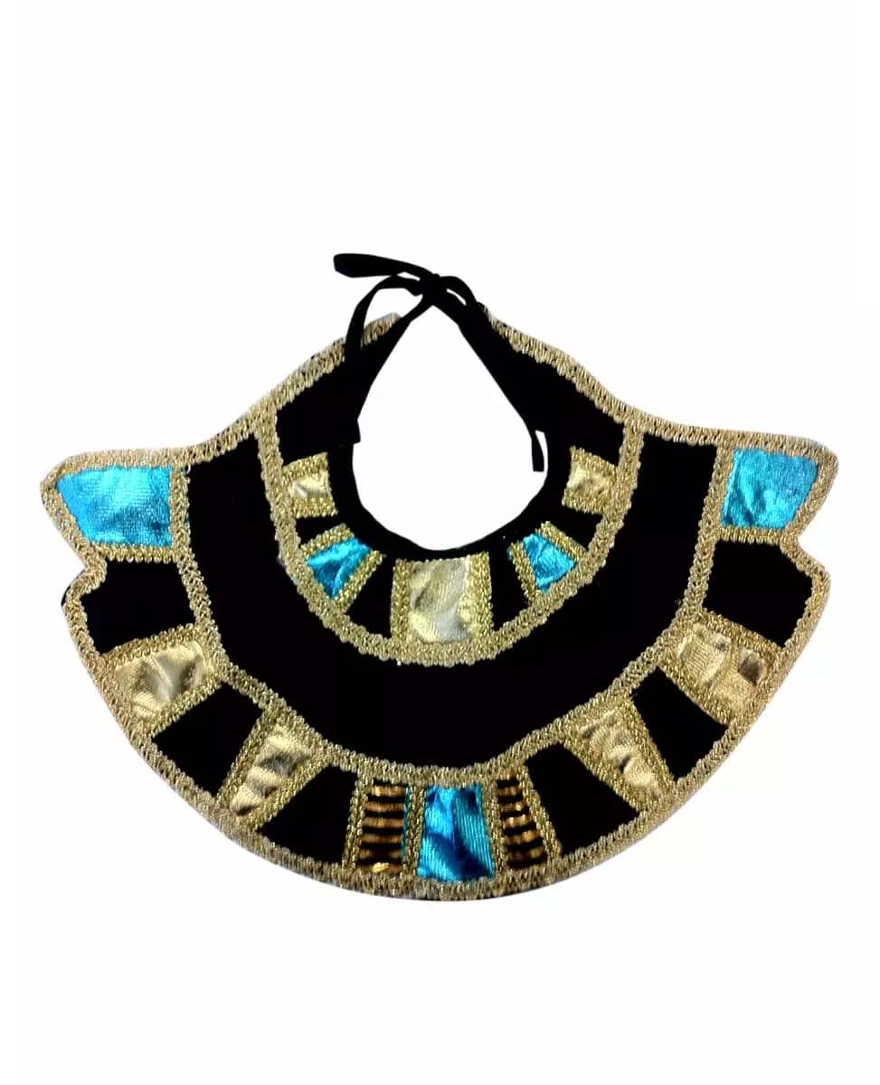 The pyramids are yours! This item is an Egyptian collar made of black fabric. It is decorated with gold and black embroidery. Small striped and turquoise squares add color to this collar. It attaches with two strings at the back of the neck. This costume will be perfect for accessorizing an Egyptian Pharaoh costume at costume parties or any other festive event. Accessories included: Collar