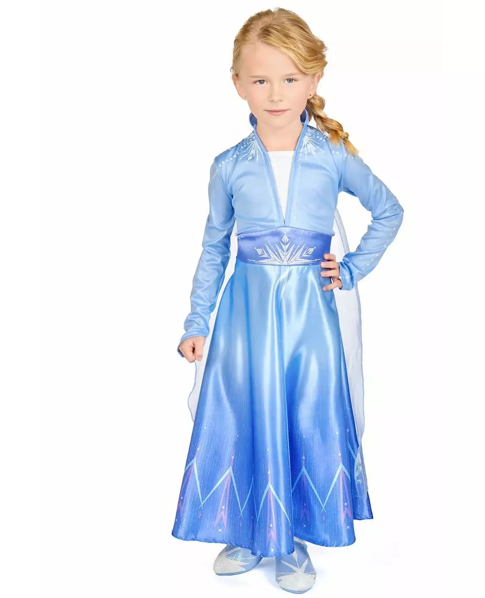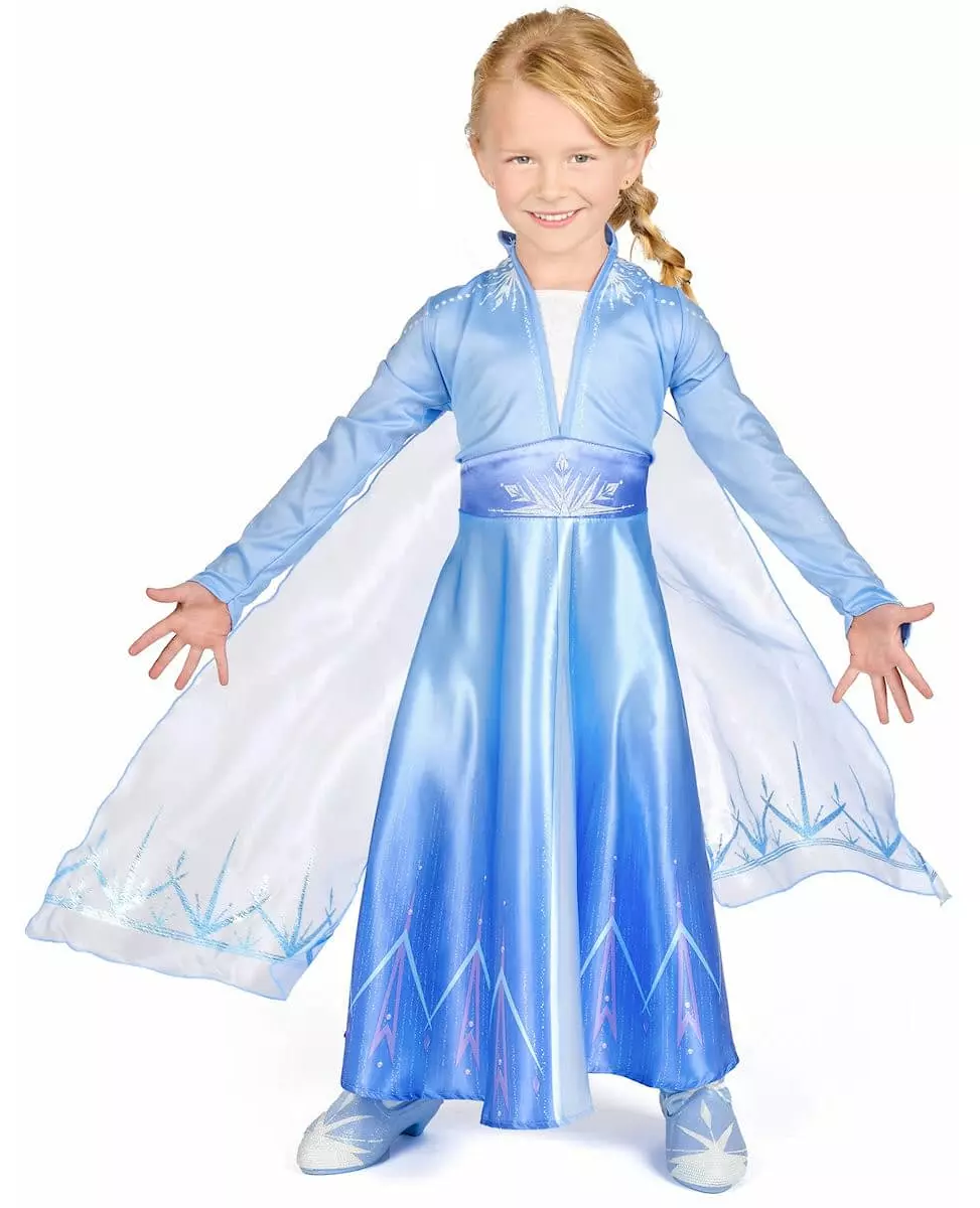 Unleash your Frozen powers! This Elsa™ costume for girls is officially licensed by Frozen™. It includes a dress. The costume dress is characterized by its long sleeves, in blue satin fabric all over, with white prints. A collar is also present, with a white part as an opening. It is decorated with a thin white cape that will be sewn directly onto it. The cape corresponds to a transparent white veil with sparkling prints. This set represents the real dress of the famous Snow Queen Elsa! Complete your child's Snow Queen outfit for a Carnival or any fancy dress party with friends! Accessories included: 1 Dress Material: 100% Polyester Care: Hand wash