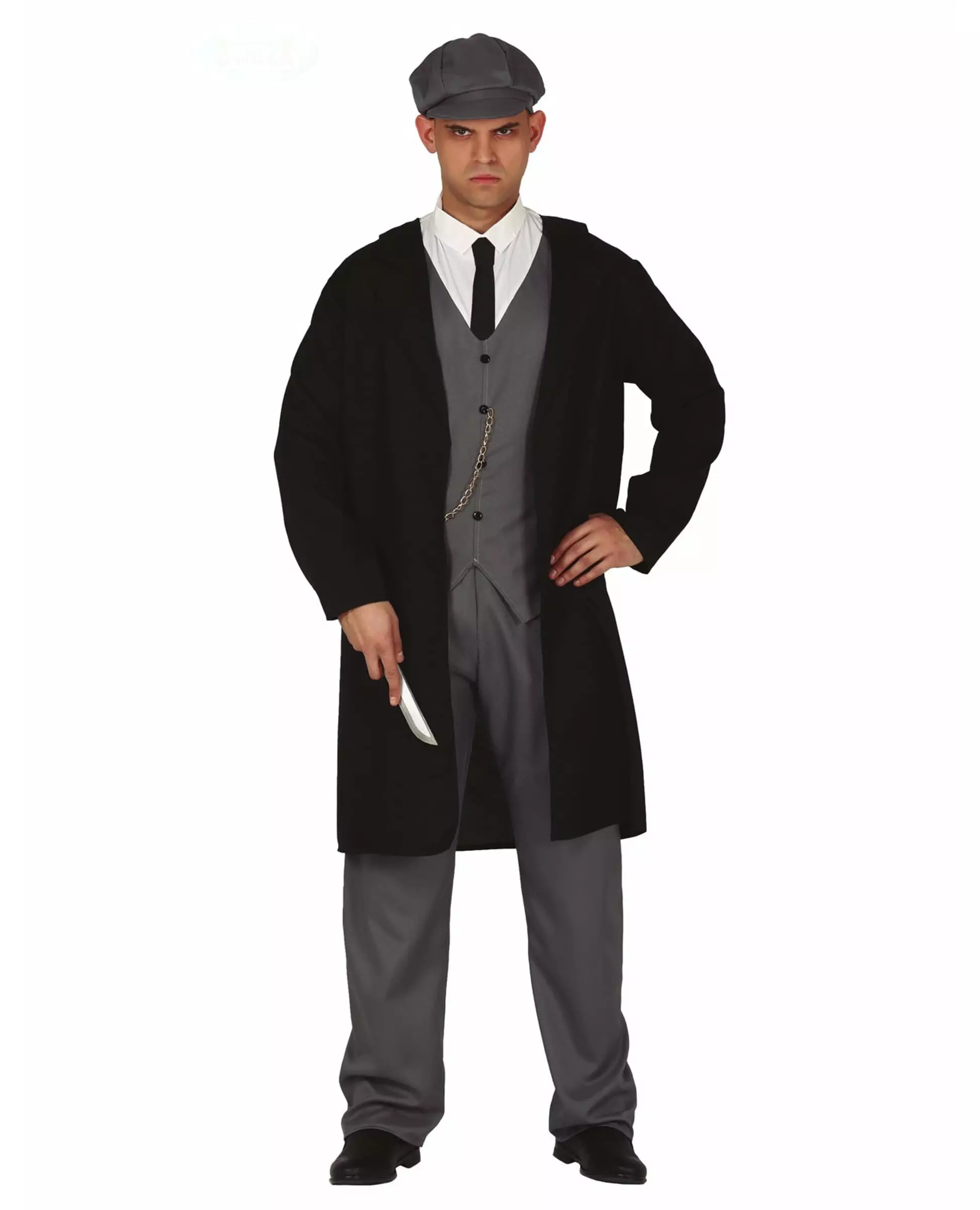 Create your own gangster gang in this retro costume. This English gangster costume for men consists of a top, a jacket, pants, and a hat (knife and shoes not included). The top is a white shirt with a gray sleeveless vest over it. A chain is attached to the side, to give a very chic dandy look to the ensemble. The long jacket is black, straight, with long sleeves. The pants are gray, to match the vest. Finally, a hat completes the ensemble. It takes the form of a retro beret, with a small visor. This costume will be perfect for pretending to be an English gangster from the 20s. Accessories included: Top Jacket Pants Hat Material: 100% Polyester Care: Hand wash