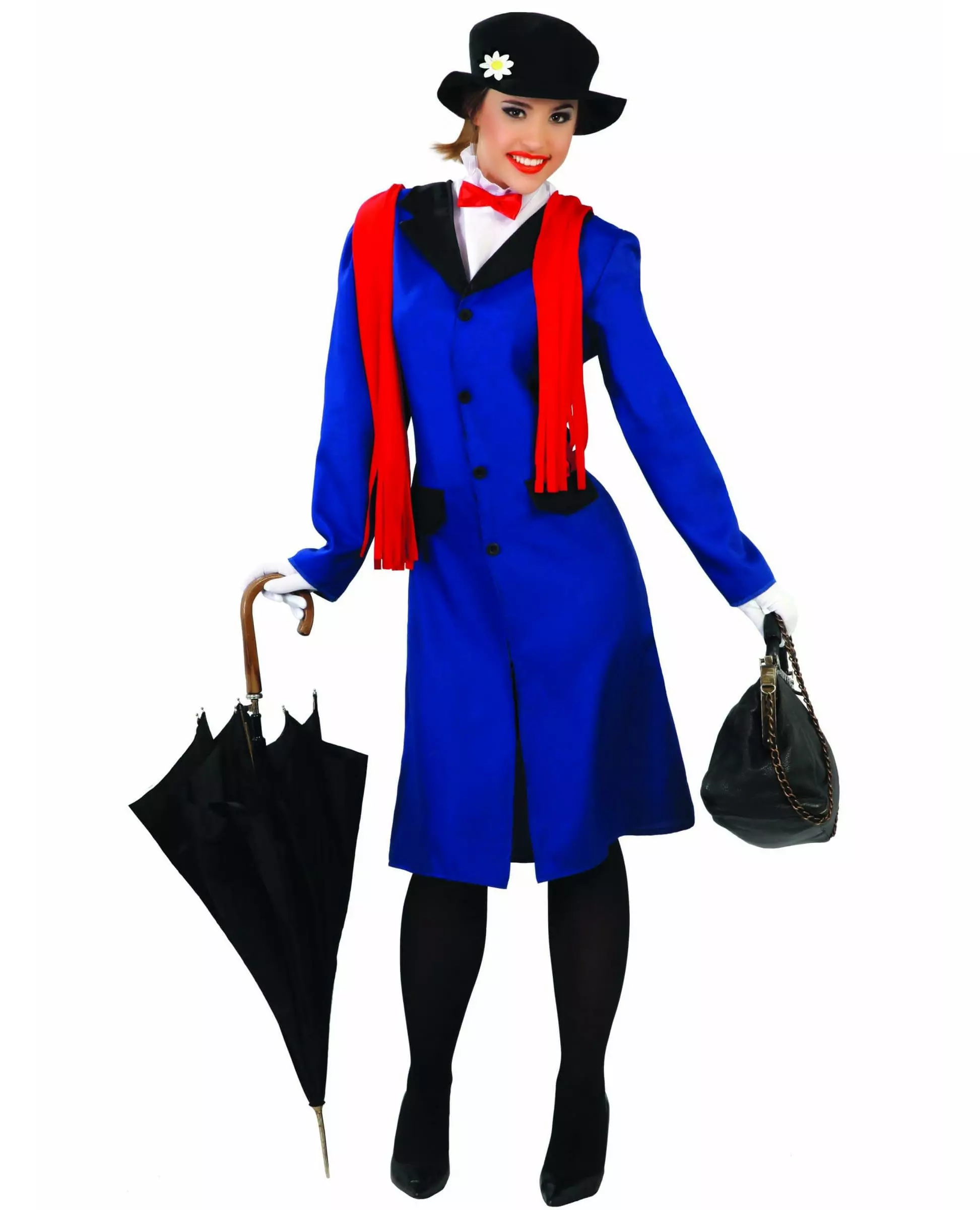 Play Mary Poppins for a fancy dress party. This English nurse costume for women consists of a jacket, a hat, and a jabot (gloves, umbrella, bag, tights, and shoes not included). The jacket is navy blue, with a black collar and fake pockets. It closes at the front with small Velcro fasteners. The buttons are purely decorative. It is completed with a white jabot that will give the illusion that you are wearing a shirt under the jacket. A red bow tie is also included. This jabot closes with Velcro. The hat is black and soft, with a small white flower on the side. The scarf is red and cut into fringes on the edges. This costume will be perfect for playing the heroine of your childhood for a fancy dress party. One size fits all, up to a 42-44. Accessories included: Jacket Hat Jabot Scarf Material: 100% Polyester Care: Hand wash Measurement information: For one size, jacket approximately 102 cm long