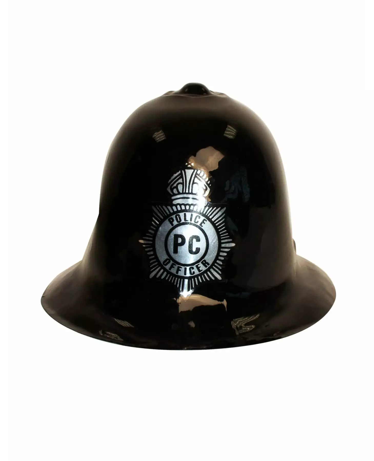 Step into the shoes of an English police officer This English police officer helmet is black in color and is made of soft plastic. A silver police badge is illustrated on the front. This accessory will perfectly complete your English police officer costume for a fancy dress party with friends or for Carnival. Accessories included: Helmet Material: 100% PVC 100% PVC