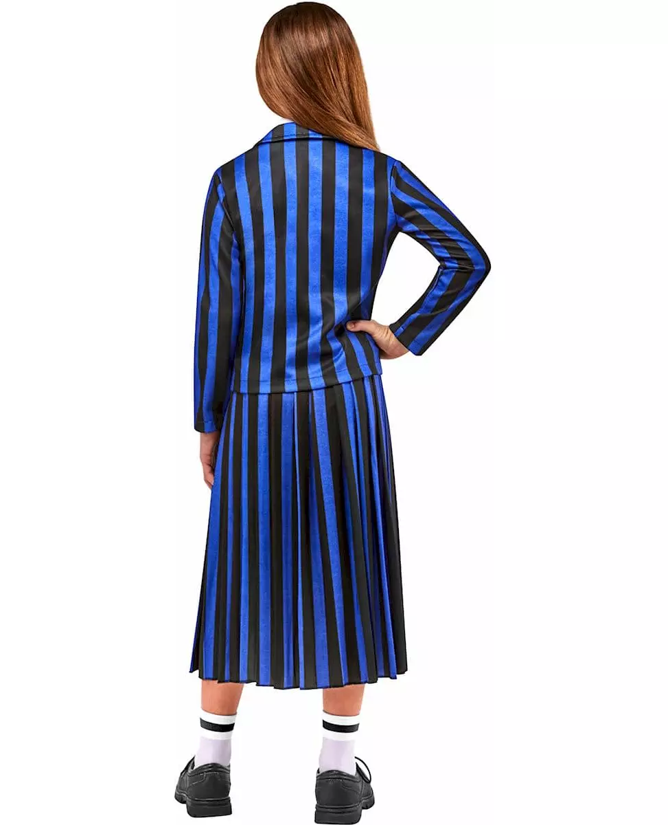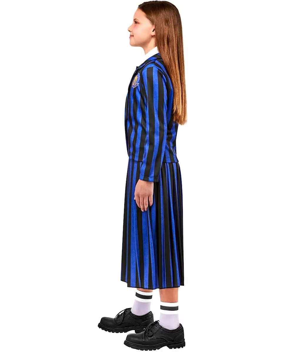 Ready to become a member of the famous Addams Family? This Enid school uniform costume is for children. It includes a jacket, a top, and a skirt. This is the uniform of the incredible Enid, Wednesday Addams' dear friend. The long-sleeved jacket is in shades of blue and black. Thanks to the small black button, you can close the jacket quickly and easily. The logo of the unforgettable Nevermore Academy will add an original touch to the jacket. The top is in shades of purple and decorated with black and white stripes. The skirt is long and the same color as the jacket. The set is made of a soft and elastic fabric for more practicality and comfort. Add a beautiful wig to imitate Enid's pretty hair and become a student of the Nevermore Academy! This Enid school uniform is just perfect for Carnival or Halloween!. Accessories included: Jacket Top Skirt Material: 100% Polyester Care: Hand wash