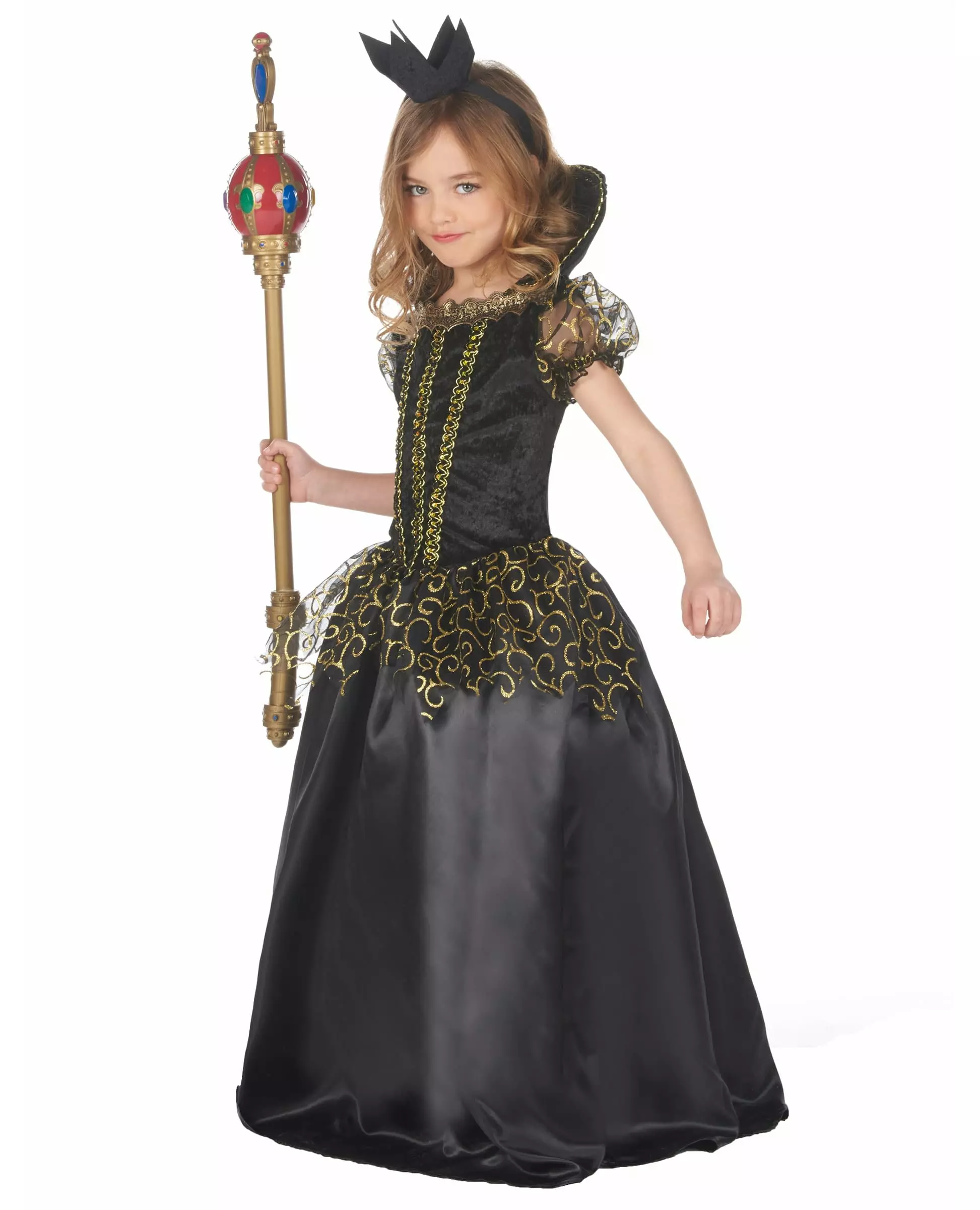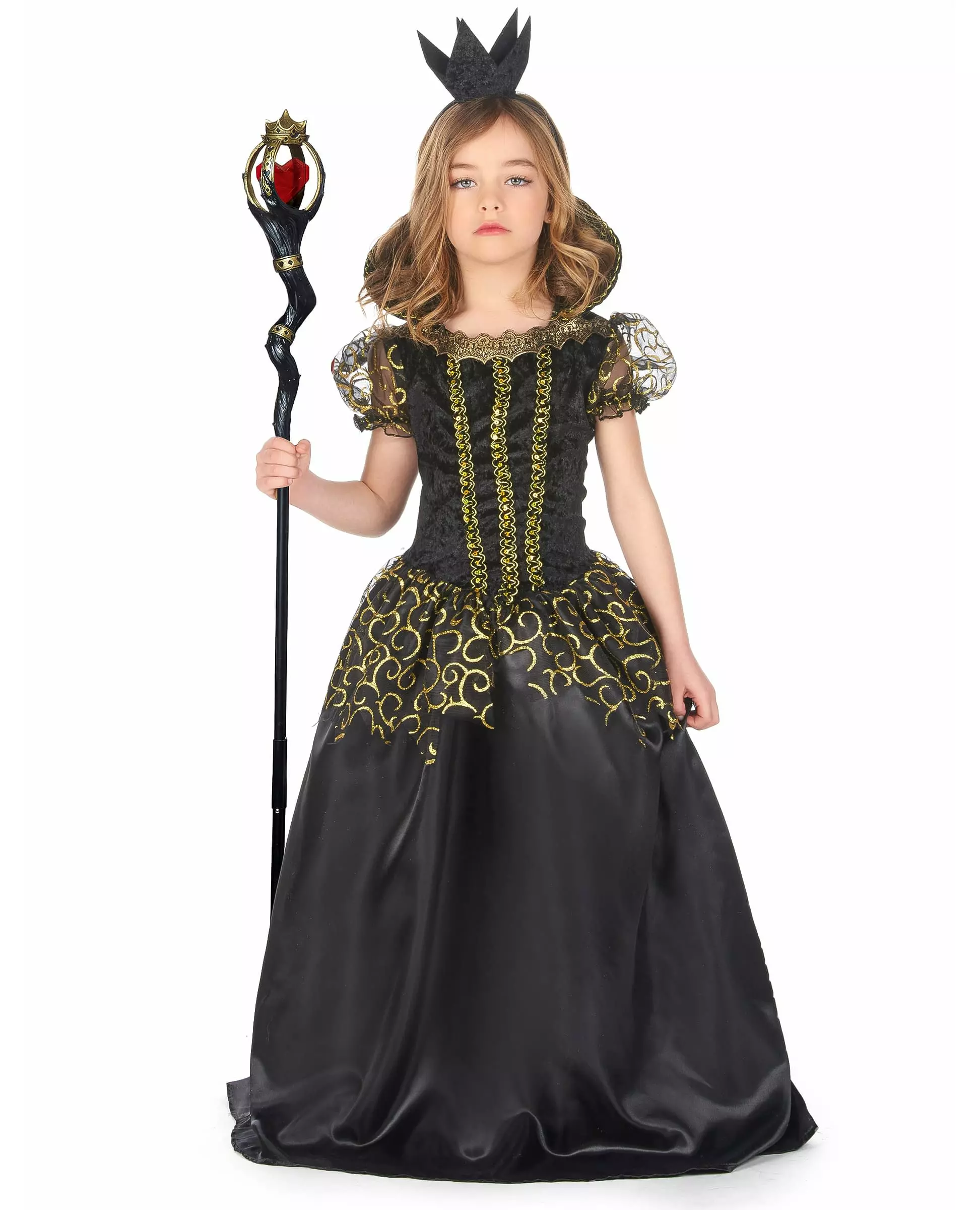 As majestic as she is wicked, the queen is causing a sensation! This evil black queen costume is for children. Composed of a dress and a headdress (scepter not included), the black queen costume is majestic thanks to its satin material and gold details. The dress is long and voluminous, with short puffed sleeves and gold arabesques at the hips. Gold edging also decorates the bust, giving the illusion of a corset. The headdress is a small hat attached to a headband for optimal support. For a fairy tale themed costume party, what could be better than an evil queen costume! Accessories included: Dress Headband Care: Hand wash
