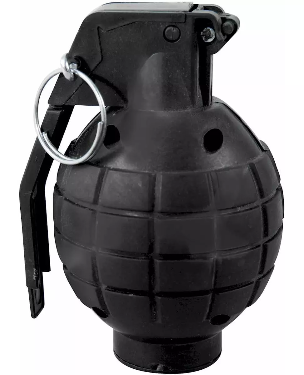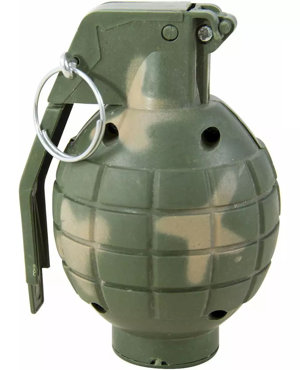 We're going to blow everything up, Colonel!!!! This fake plastic military grenade measures approximately 9 cm in height. The color will be delivered randomly: either camouflage green or black. Simply pull the pin and release the lever to hear the sound of an explosion and the light. (2 AA batteries included) This very realistic fake grenade will be perfect to complete your soldier costume and go to the front during a costume party. Accessories included: Grenade Material: Plastic