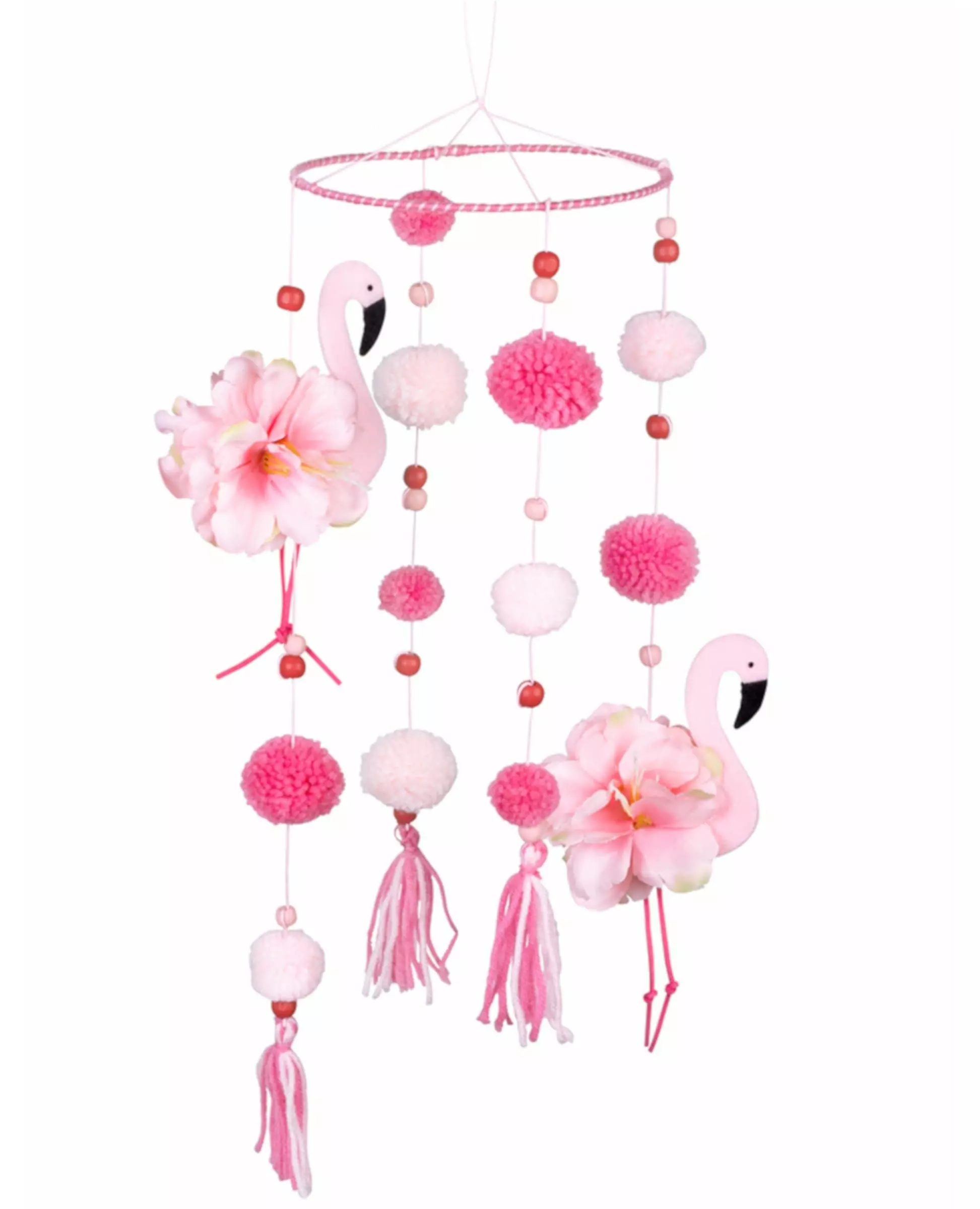 Fill up on sweetness with this pink flamingo hanging decoration! This pink flamingo mobile is made up of pink pompoms, wooden beads and pink flamingo flower-shaped decorations. Its dimensions are approximately 60 x 16 cm. This hanging decoration will be ideal for enhancing your decoration for a birthday or a Hawaiian party!. Accessories included: 1 Hanging decoration