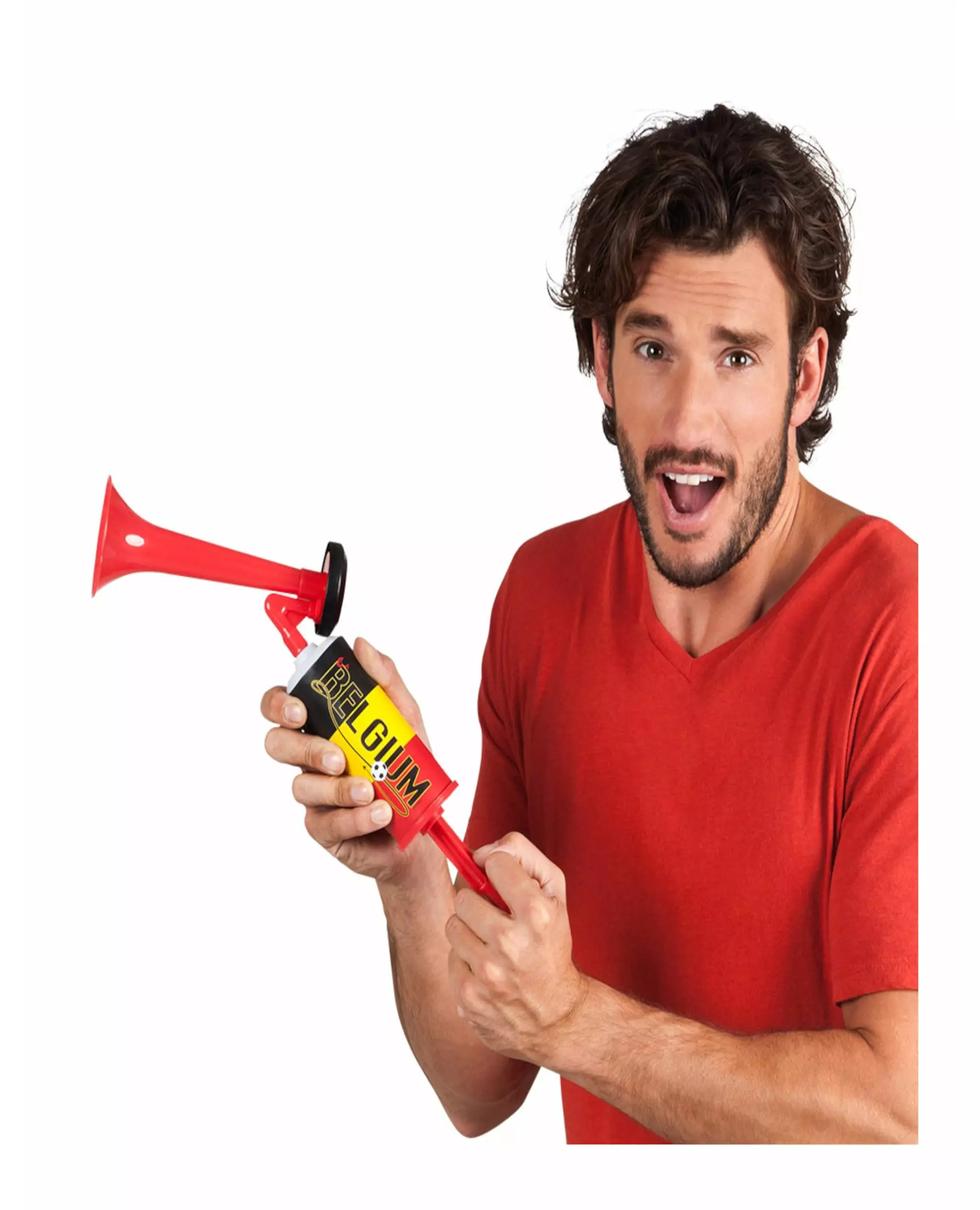Long live Belgium! This fog horn is for Belgian supporters. Made of plastic, it is black, red, and yellow. It has a print representing the Belgian flag on which devil horns, a devil tail, and a ball are present. Simply pull the tip to operate the fog horn. It is removable for easy transport. This horn will be perfect for cheering on the Belgian team during a sporting event like the World Cup or the Euro Cup! Accessories included: 1 Fog horn Material: Plastic Care: Do not wash