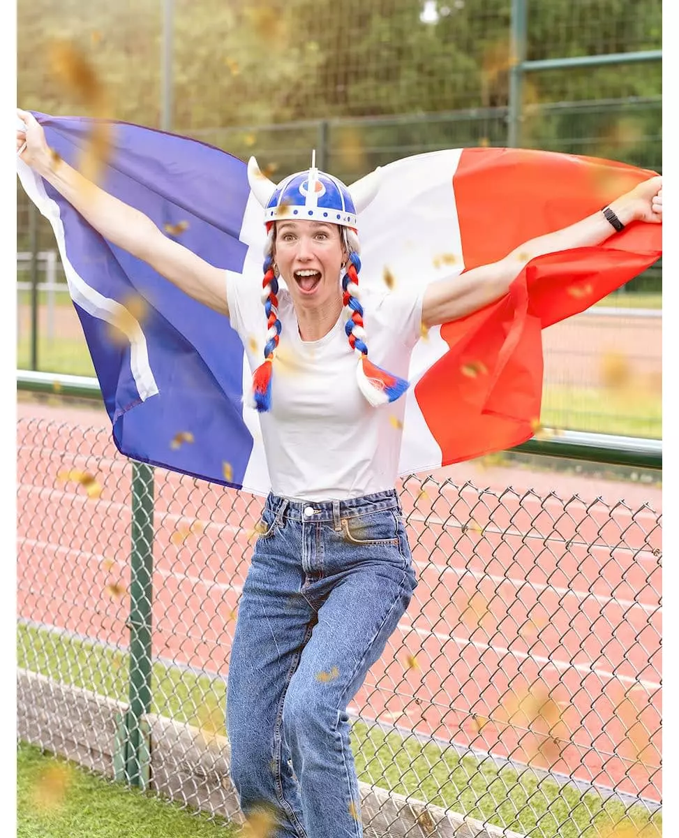 Show off the colors of France! This large blue, white, and red France supporter flag measures approximately 90cm x 150cm. It will be the essential accessory for waving the French tricolor flag in the stands of a stadium or for decorating a room for a World Cup or a national holiday. Accessories included: Flag Material: 100% Polyester