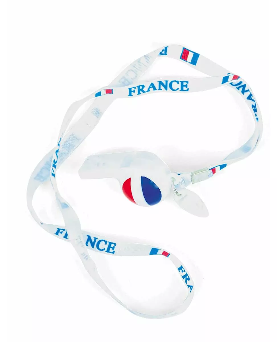 A perfect whistle for a true France supporter This accessory is a supporter's whistle and neckband. The ideal accessory for supporting France at the next World Cup! Material: Neckband: 100% polyester + Polypropylene whistle