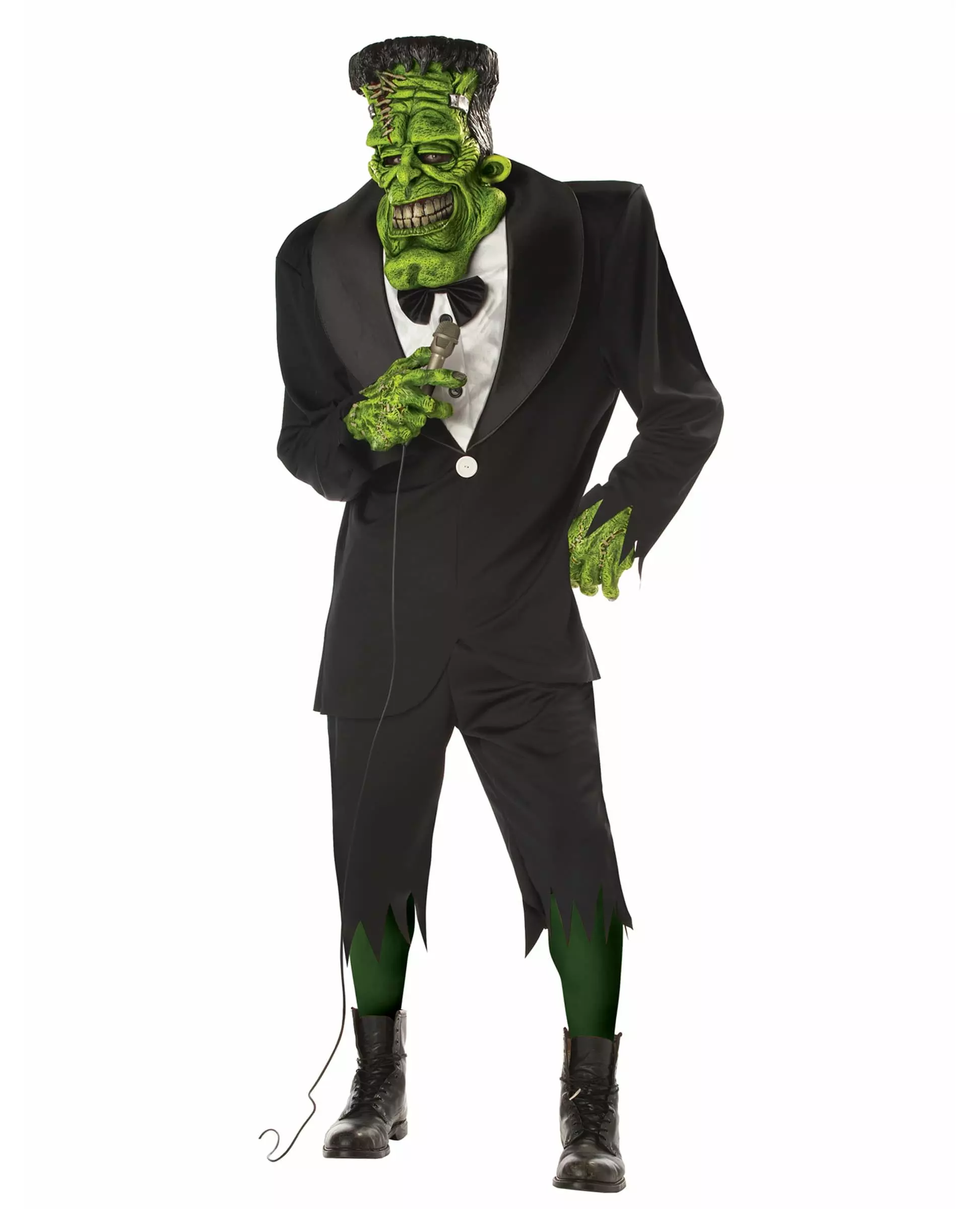 Terrorize your friends with this complete costume! This adult Frankenstein costume consists of a top, pants, a pair of gloves, a mask, socks, and inflatable shoulders (shoes and microphone not included). The top gives the illusion of a suit jacket. It is black, and a white panel representing a shirt with a bow tie is present at the chest. The sleeves are long and serrated at the ends, and the collar is made of foam. Fake buttons are also sewn onto the front of the garment. Finally, inflatable shoulders, very easy to use, will add a puffy effect to the outfit. The black pants have an elastic waistband for maximum comfort. It is serrated at the ends and will reach your knees. A full-face mask representing the character's head is also included. It is made of soft latex and has very realistic finishes. Soft latex gloves and large green socks will accessorize this set. This costume will be perfect for terrorizing those around you on Halloween night, for example. Accessories included: Top Pants 2 Gloves Mask Socks Inflatable shoulders Material: 100% polyester Care: Hand wash Measurement information: For size L, top length approximately 90 cm