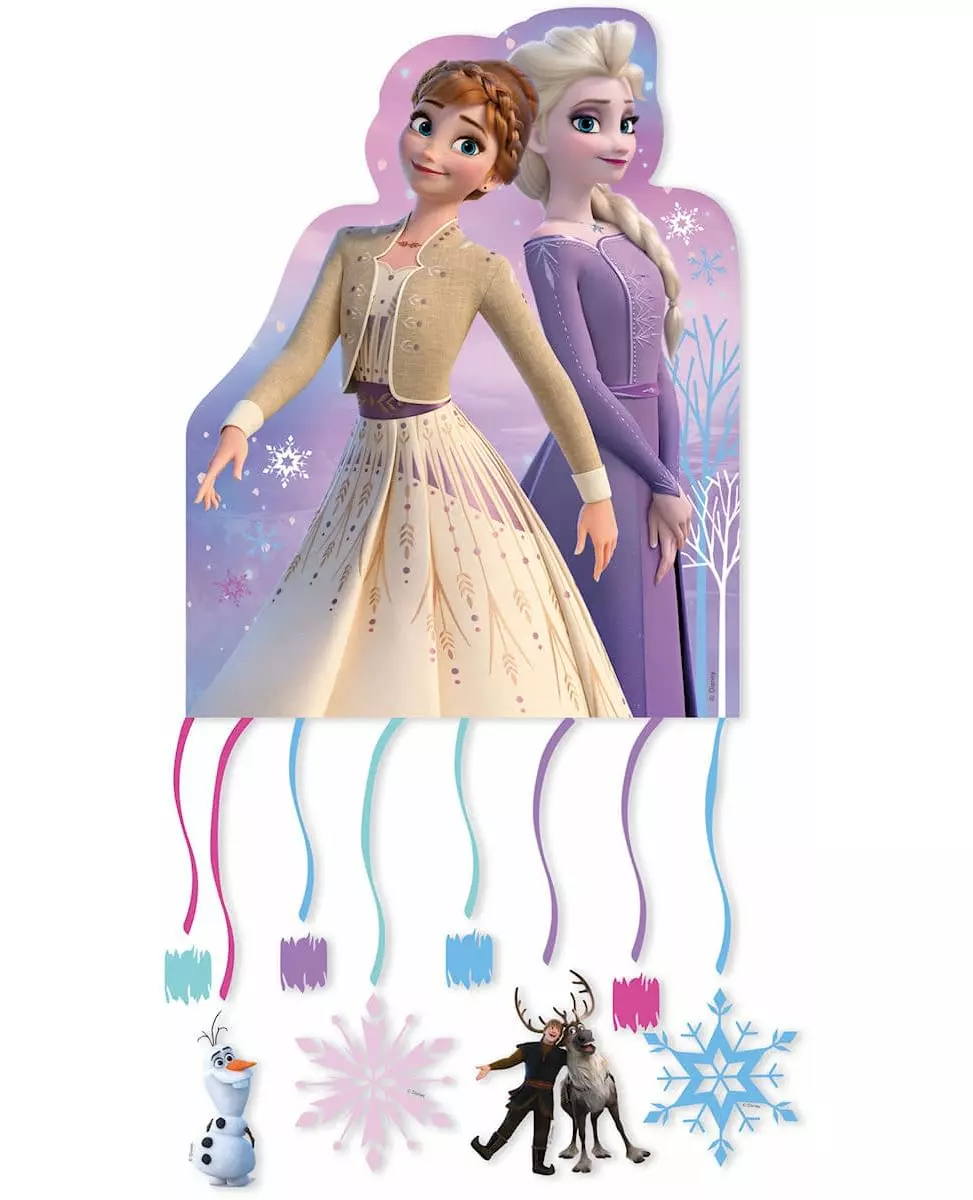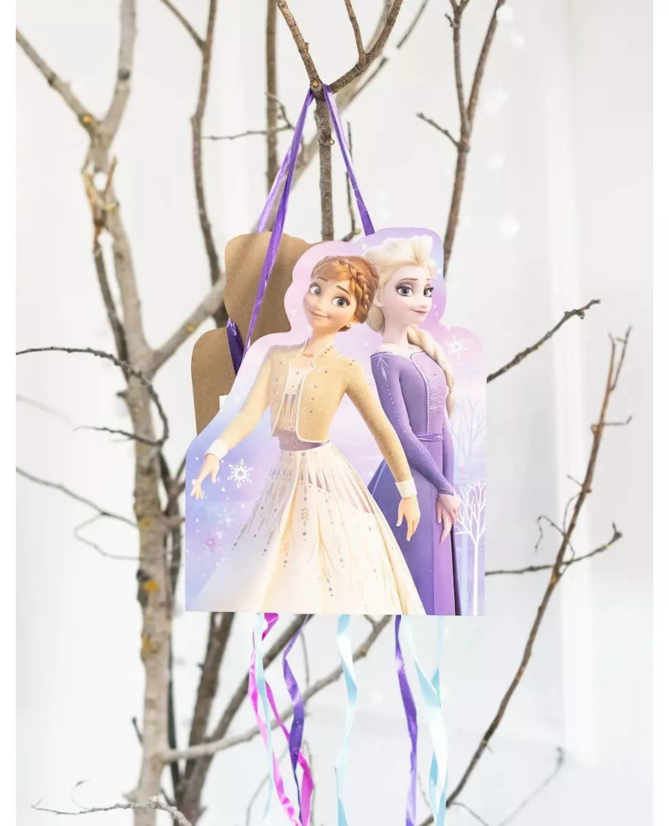 Pull the right string for a treat! This piñata is officially licensed by Frozen™. Made of paper and cardboard, it is decorated with the famous characters from the cartoon, Elsa and Anna. You will also find Olaf, Sven and Kristoff on the lower part. Colorful ribbons made of cardboard stickers are present under the piñata. Aim of the game: Fill your piñata with all kinds of surprises (candy, confetti, gifts, etc.). Take turns pulling the ribbons. One of them will open the piñata and release its contents. Ideal for little ones! Create a fun activity for your child's birthday party! Accessories included: 1 piñata Material: Paper, cardboard