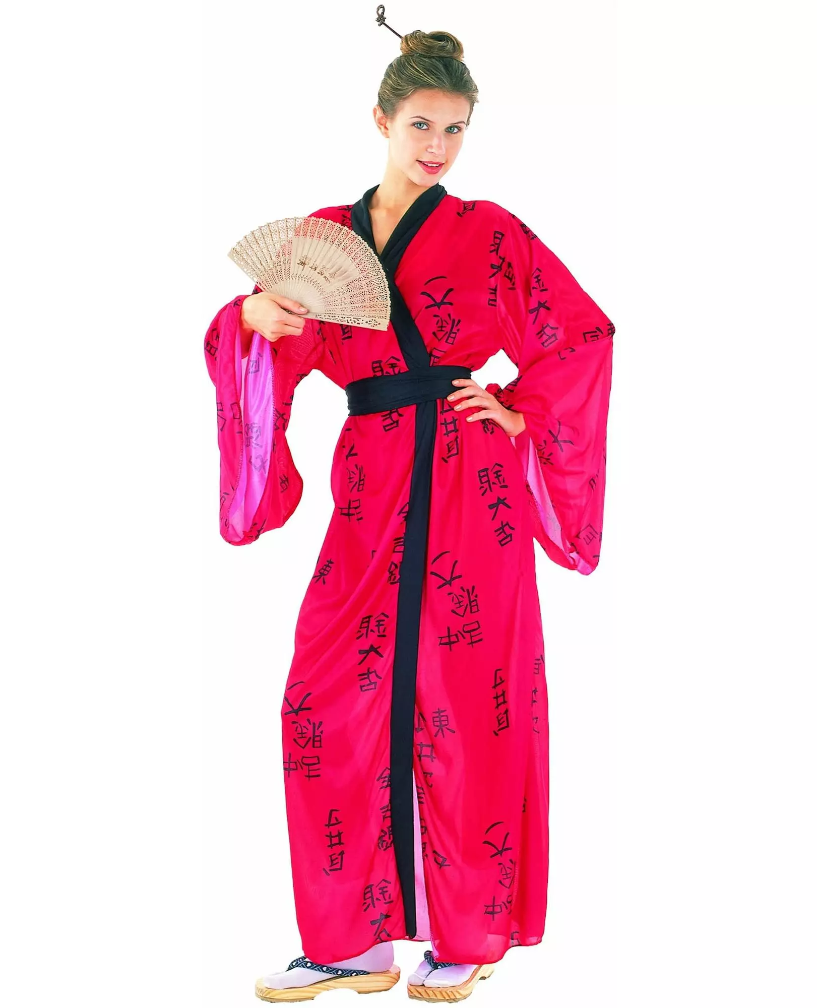 Welcome to Asia! This geisha costume for women consists of a kimono and a belt. The kimono is red with a print representing Asian writing. A black bias finishes the kimono. The wide belt is black. You can easily tie it around your waist. This costume is ideal for going to an Asian-themed party or for carnival. Accessories included: Kimono Belt Material: 100% Polyester Care: Hand wash