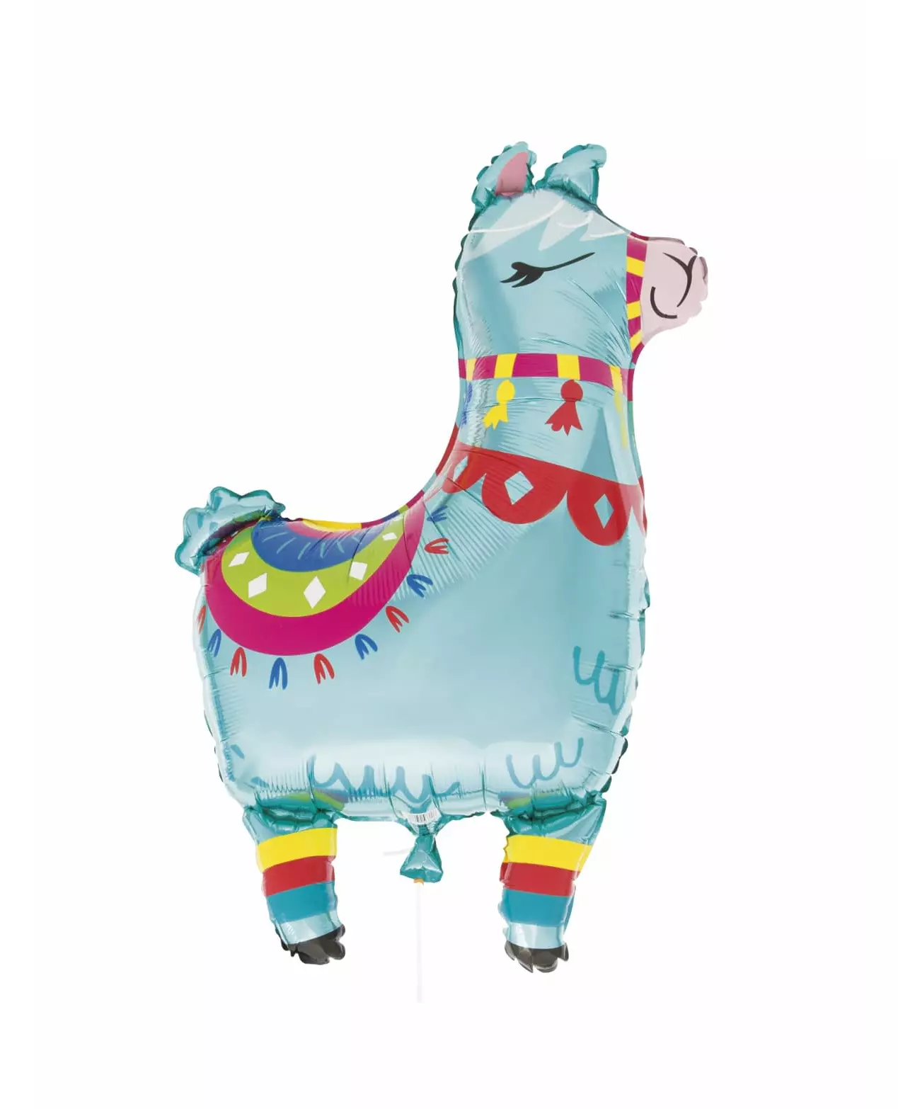 A cute llama is coming to your decor! This giant balloon is shaped like a blue llama. It measures approximately 90 cm and is made of aluminum. Inflate it with air using a straw or with helium to make it fly. This balloon will complete your llama birthday decoration!. Accessories included: 1 Balloon Material: Aluminum
