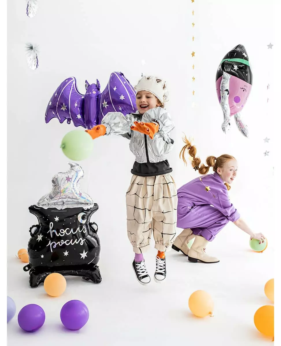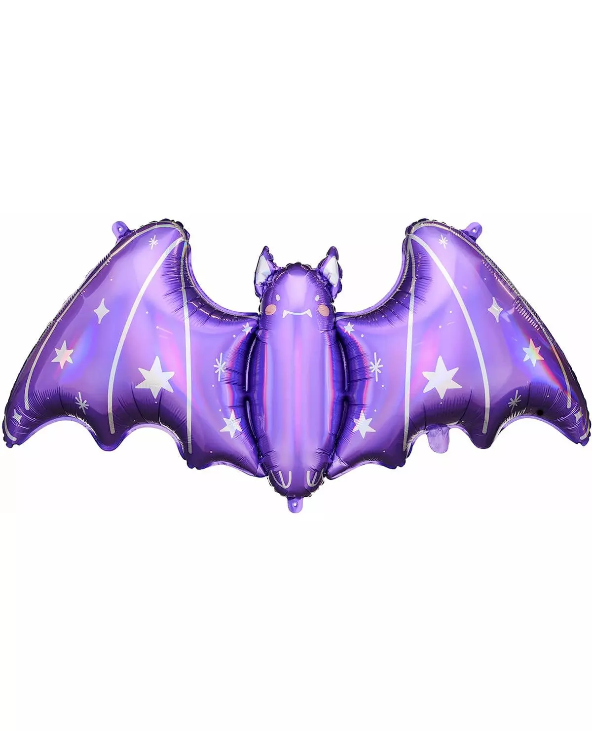 Adorable Bat! This giant balloon is made of aluminum and measures approximately 119 x 51 cm. It represents an adorable purple bat. It is decorated with stars of different sizes. This giant bat balloon will be a sensation at your Halloween party!. Accessories included: 1 Balloon Material: Aluminum