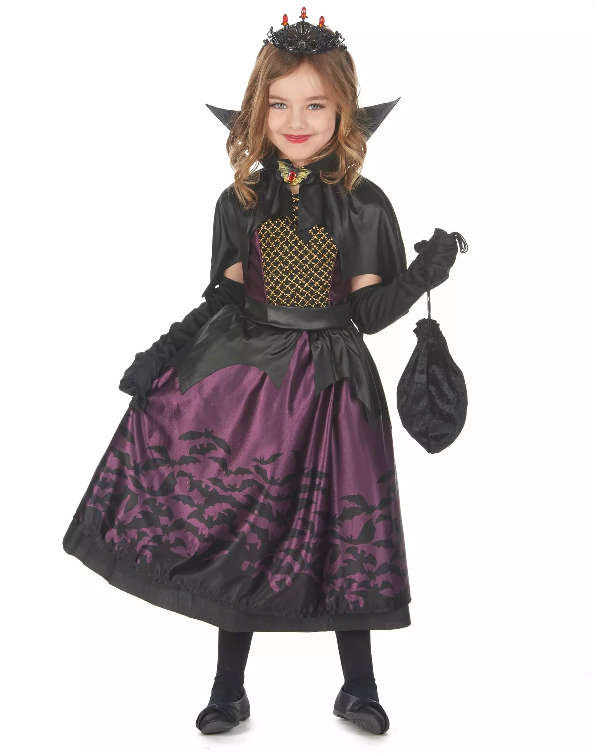 An adorable little bat! This girl's bat costume consists of a dress, a shoulder cover, and gloves (tights, shoes, and hair accessories not included). The dress is purple and has a fake belt and black ruffles at the waist. The center of the top of the dress is black and gold. The bottom is purple and is decorated with bats flying into the night. The shoulder cover is black with a high collar. It is decorated with a magnificent golden bat with a red jewel. The long gloves are black with a satin effect. This cute bat costume will be ideal for your daughter for your Halloween party! Accessories included: Dress, Shoulder cover, Gloves,