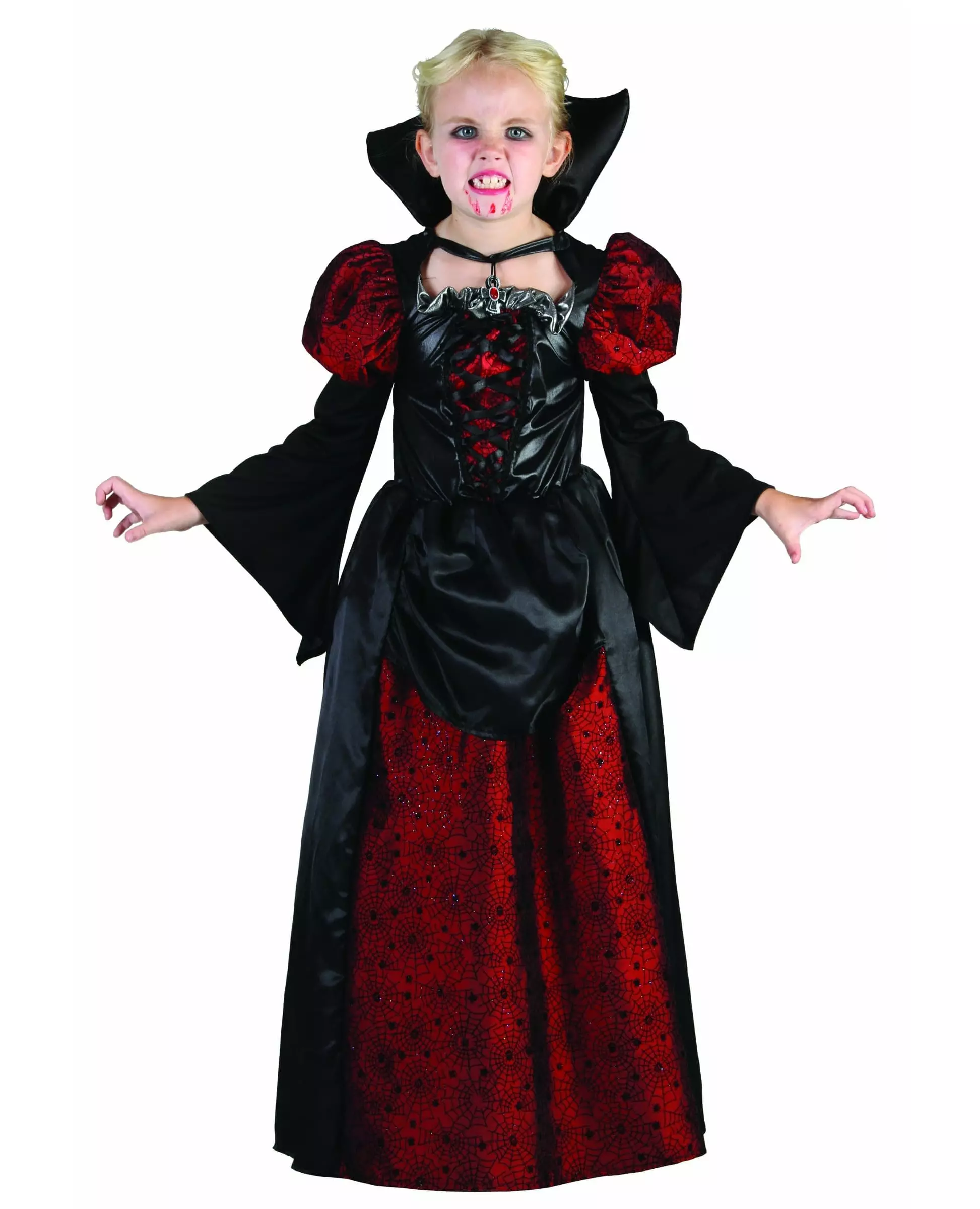 Choker included! This satin-feel vampire costume for girls consists of a 116 cm long dress and a cross-shaped choker. The top of the dress resembles a black vinyl-effect and burgundy red bustier. A high collar enhances the top of this dress. This dress has an elastic waistband that will make it comfortable to wear and will adjust to your daughter's figure. The bottom of the dress is made of black satin fabric with a short ruffle for a rococo vampire look. The front of this dress is also burgundy with black patterns to match the bodice and puffed sleeves. A black choker comes with this outfit. With a cross pendant adorned with a faux red ruby in the center, it adds value and charm to this outfit. This vampire costume for girls will send shivers down the spines of those around you at fancy dress events such as Halloween!. Accessories included: Dress Choker Care: Hand wash