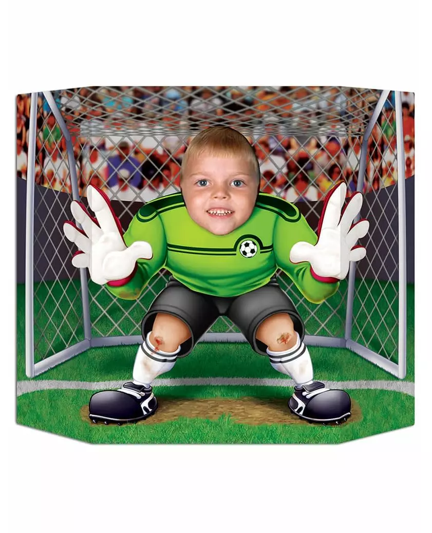 Feel like a real footballer This original cardboard decoration with a cutout to pass the face through for a photo. It measures 94 x 64 cm. Everyone strikes a pose and becomes, for a moment, a goalkeeper in suspense. Ideal for decorating a room at a children's birthday party or a themed evening on sports, football, etc. Accessories included: 1 Headpiece Material: Cardboard