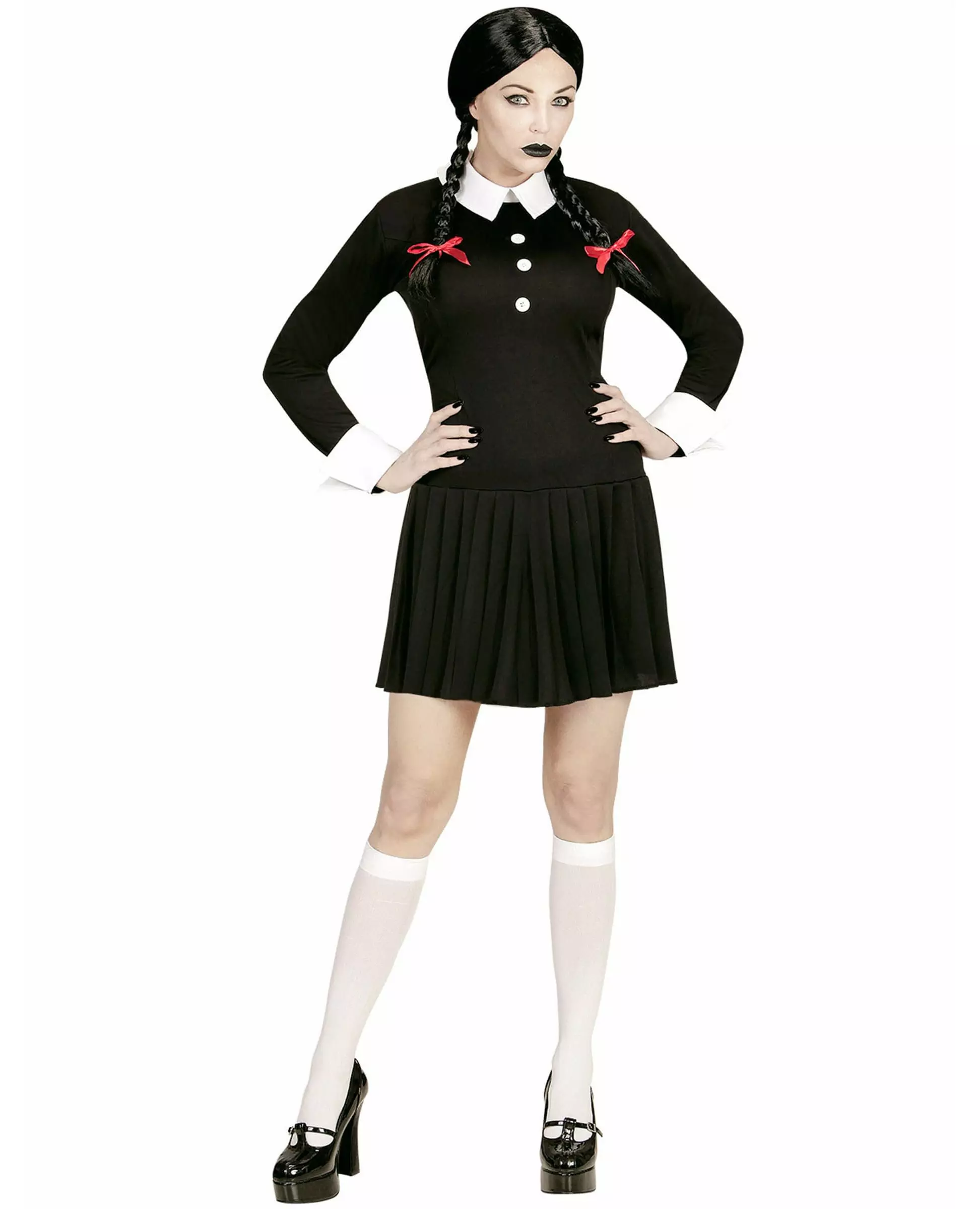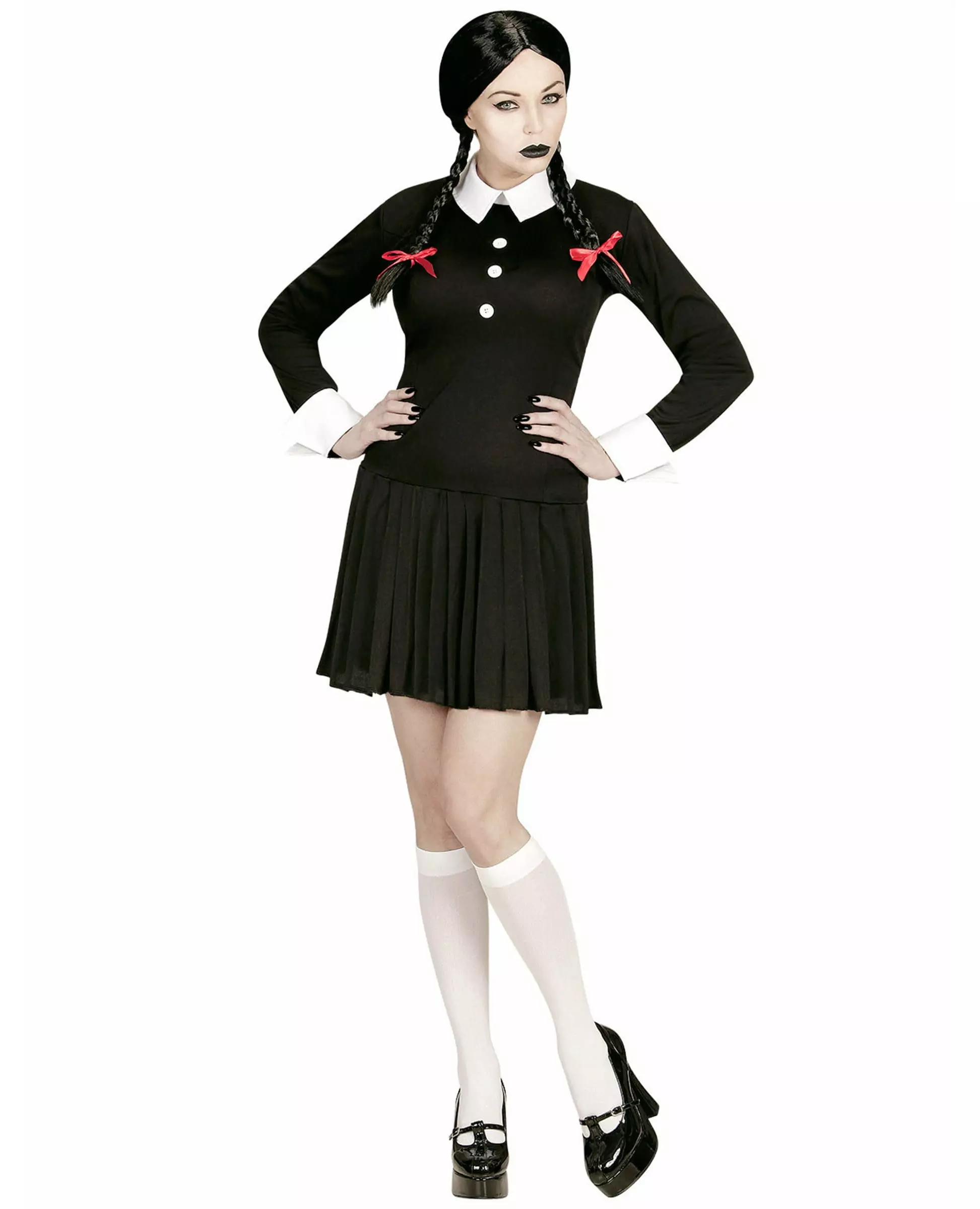Dress up as a gothic schoolgirl for Halloween! This gothic schoolgirl costume for women includes the dress (shoes, tights and wig not included). The dress is short and black with long sleeves, fitted at the waist. It has 3 white buttons and a white school collar. With makeup, highlight your face with light foundation and voila, you're ready for Halloween!. Accessories included: Dress Material: 100% polyester Care: Hand wash