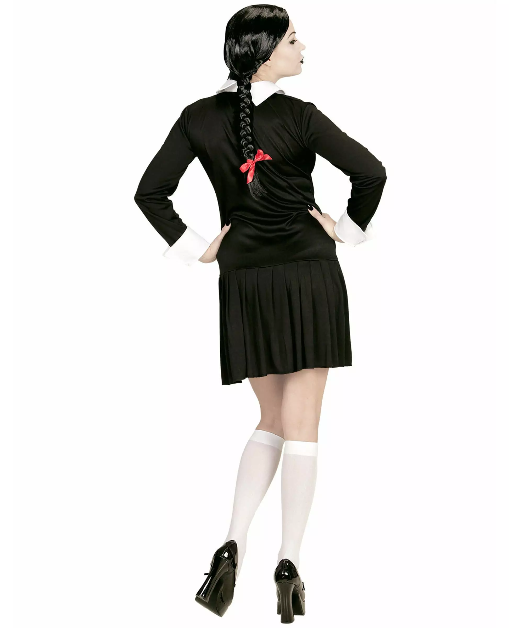 Dress up as a gothic schoolgirl for Halloween! This gothic schoolgirl costume for women includes the dress (shoes, tights and wig not included). The dress is short and black with long sleeves, fitted at the waist. It has 3 white buttons and a white school collar. With makeup, highlight your face with light foundation and voila, you're ready for Halloween!. Accessories included: Dress Material: 100% polyester Care: Hand wash