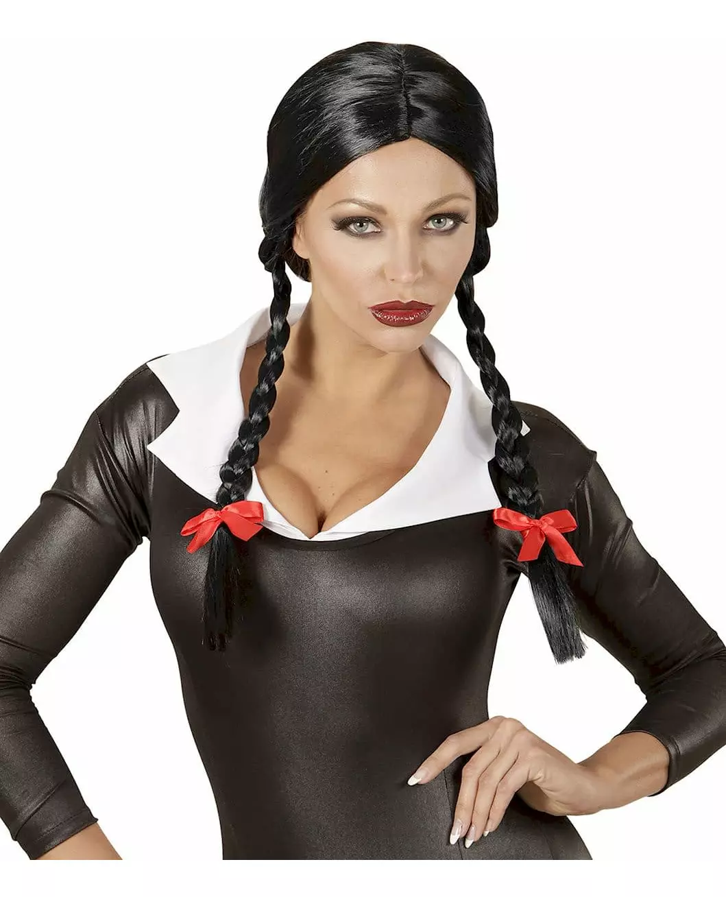 Need a gothic wig? This gothic wig is for women. It is made of black synthetic hair, which forms a braid on each side of the head. It will be ideal to perfect your gothic costume for Halloween. Accessories included: Wig Material: 100% Polyester